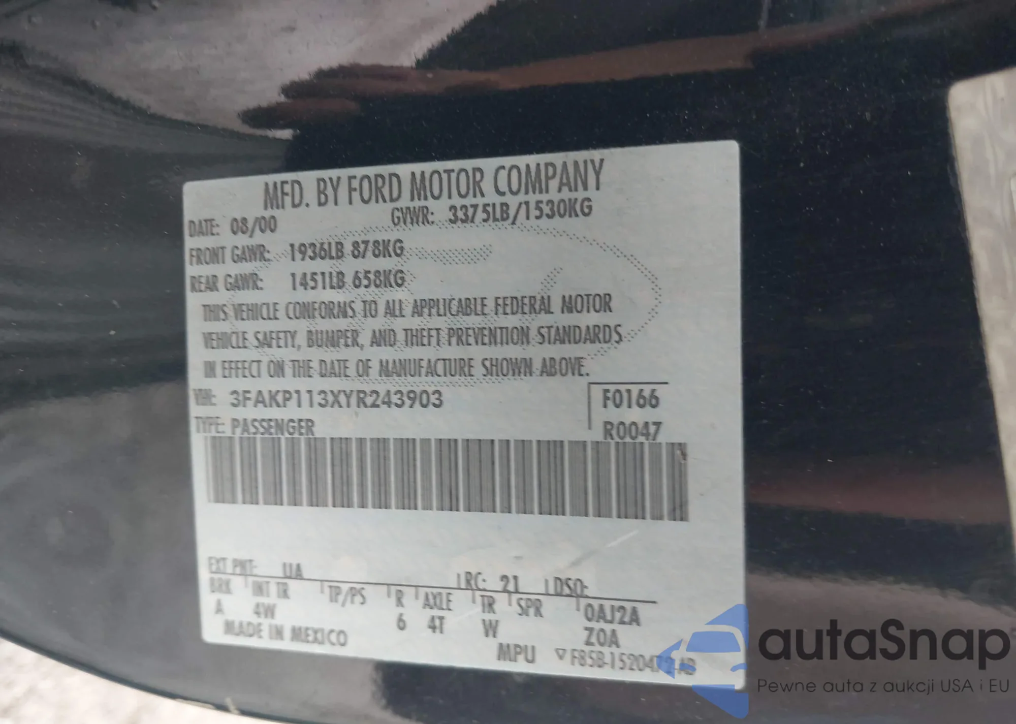 LOT: 43286468 VIN: 3FAKP113XYR243903