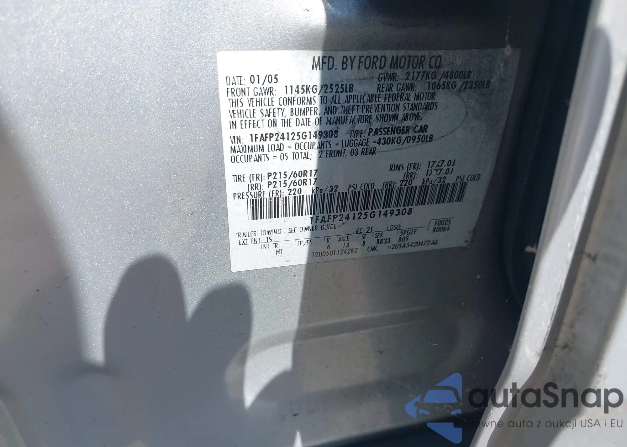 LOT: 43271421 VIN: 1FAFP24125G149308