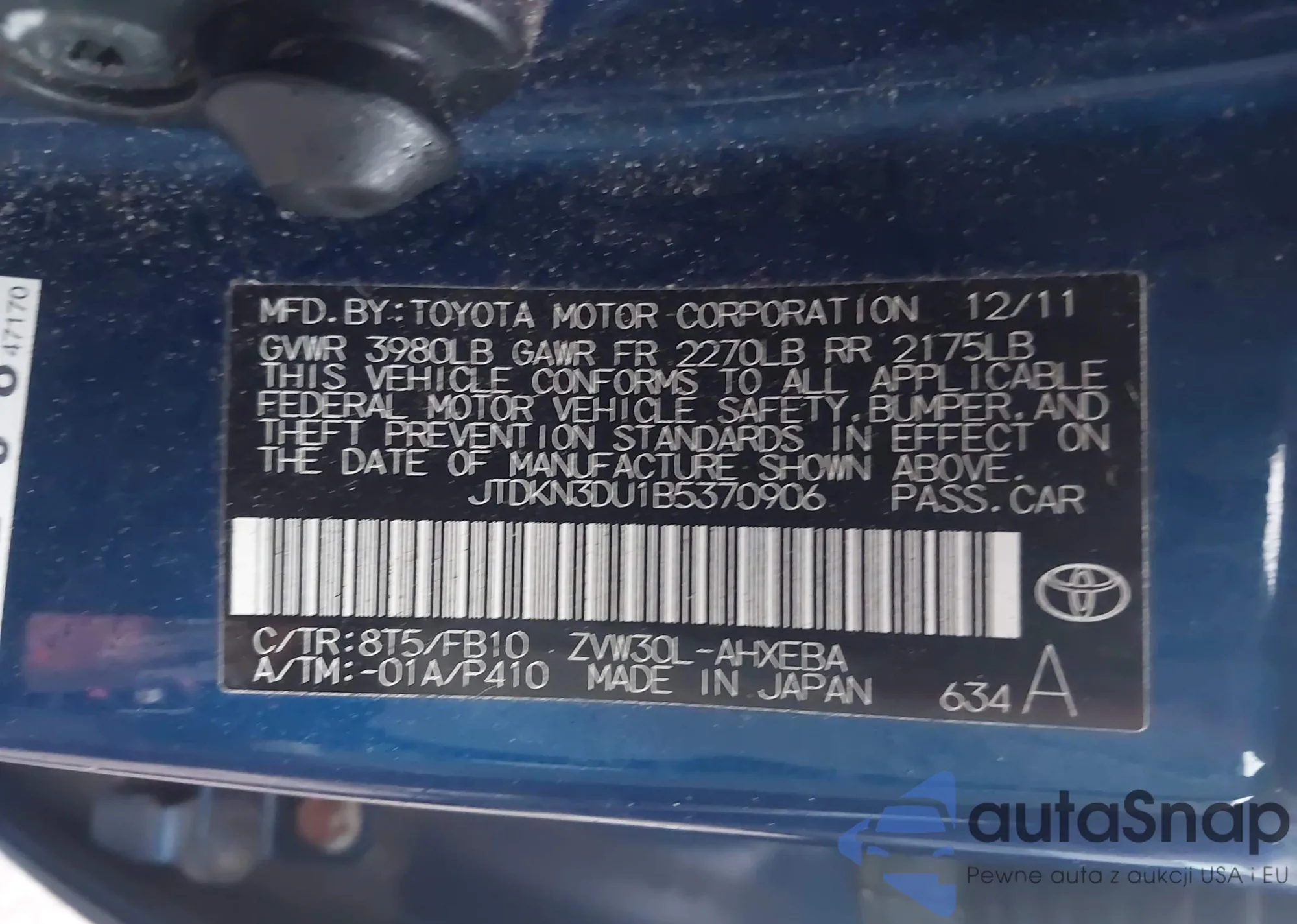 LOT: 43273981 VIN: JTDKN3DU1B5370906