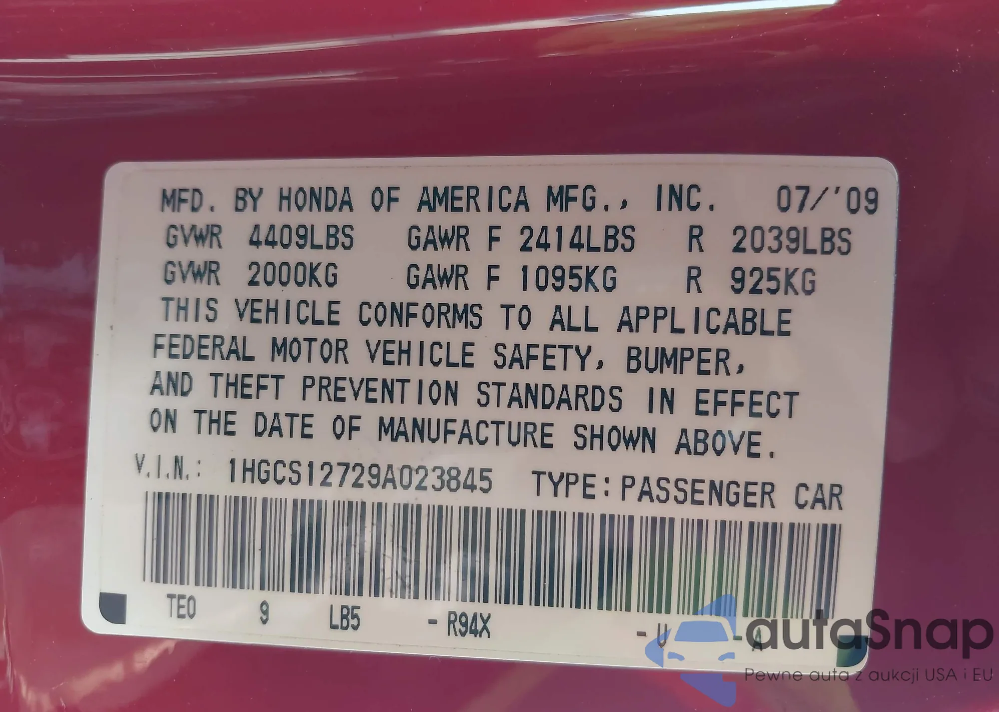 LOT: 43151454 VIN: 1HGCS12729A023845