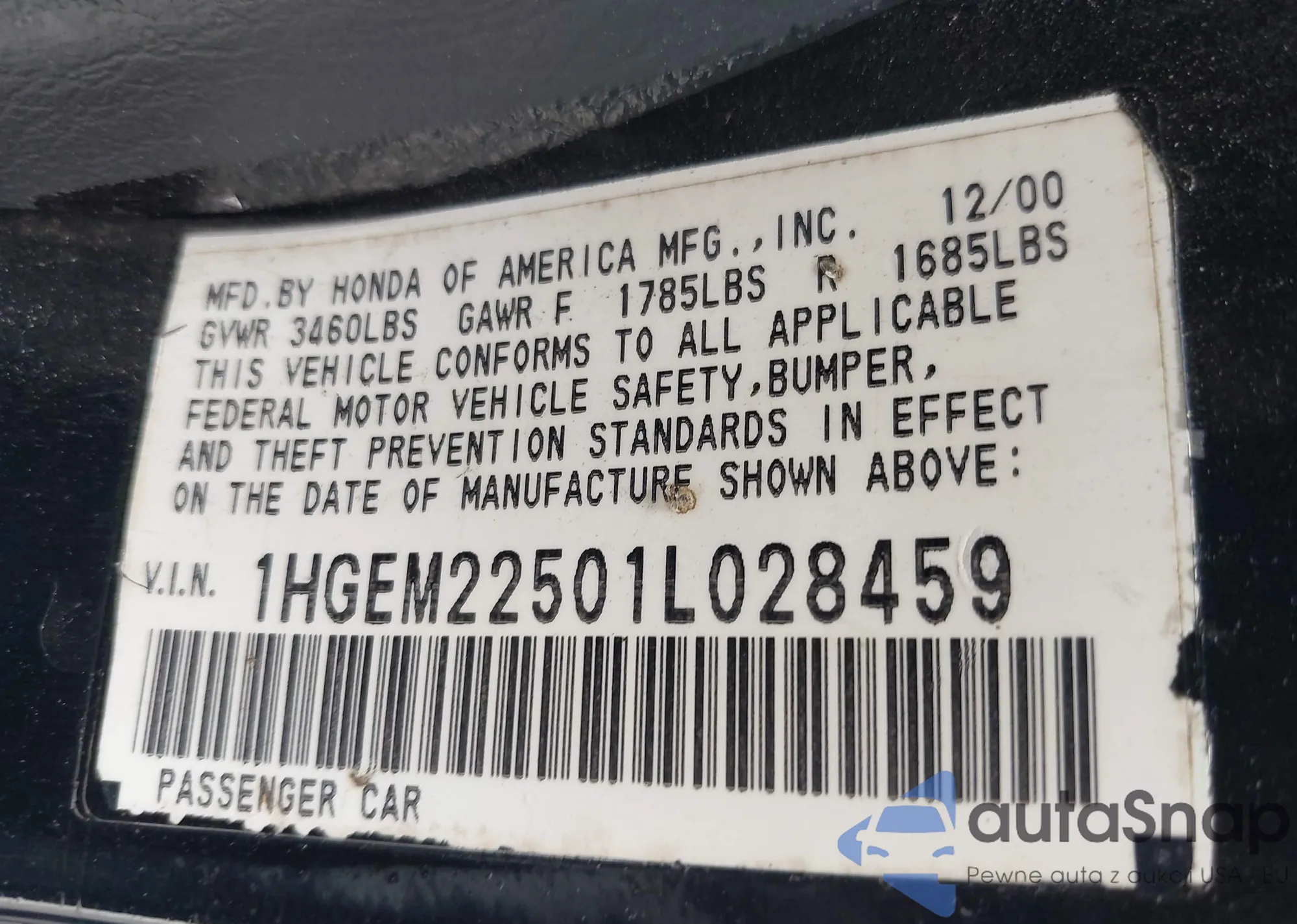 LOT: 42987921 VIN: 1HGEM22501L028459