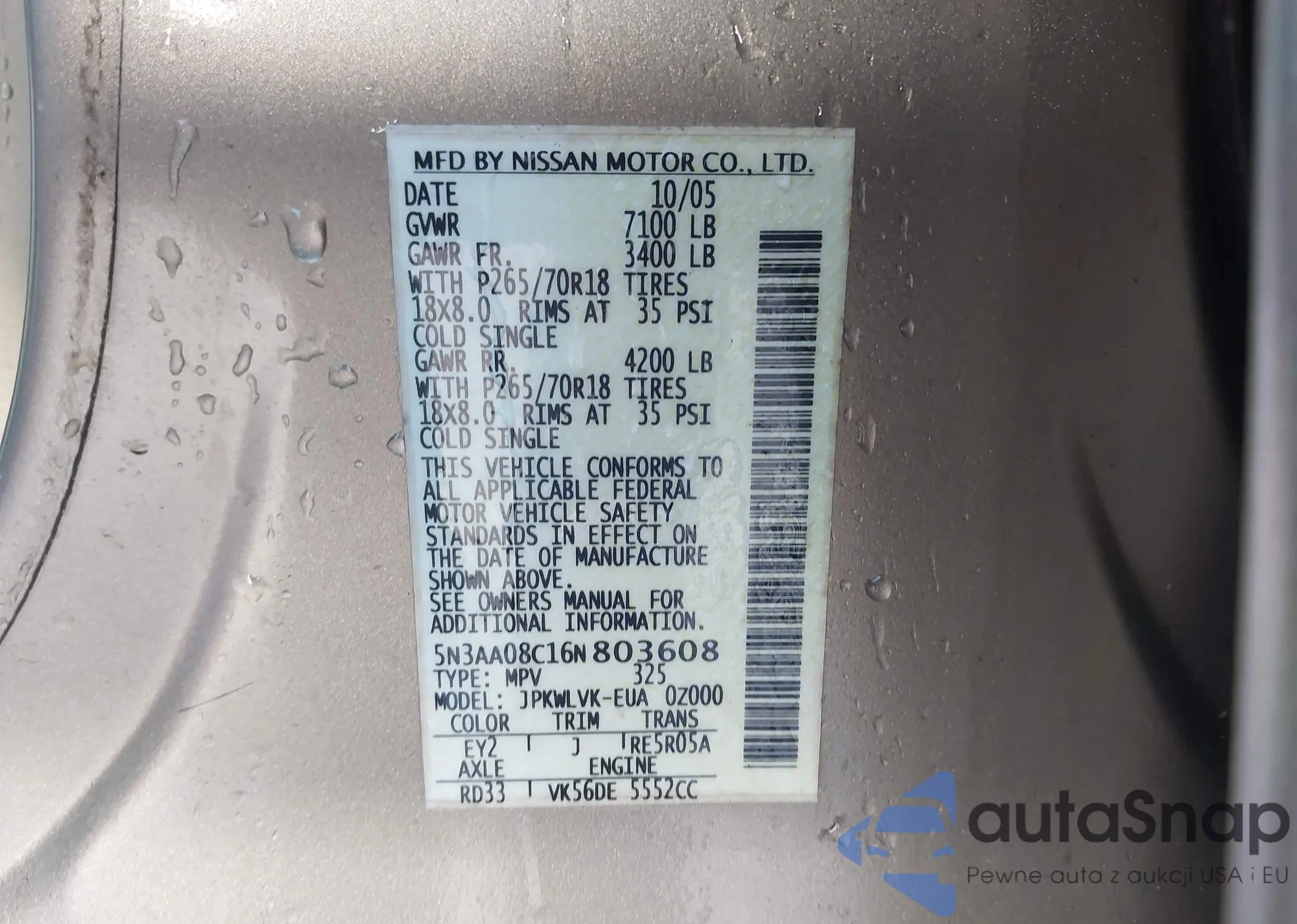 LOT: 43090991 VIN: JN8AZ08T25W331888