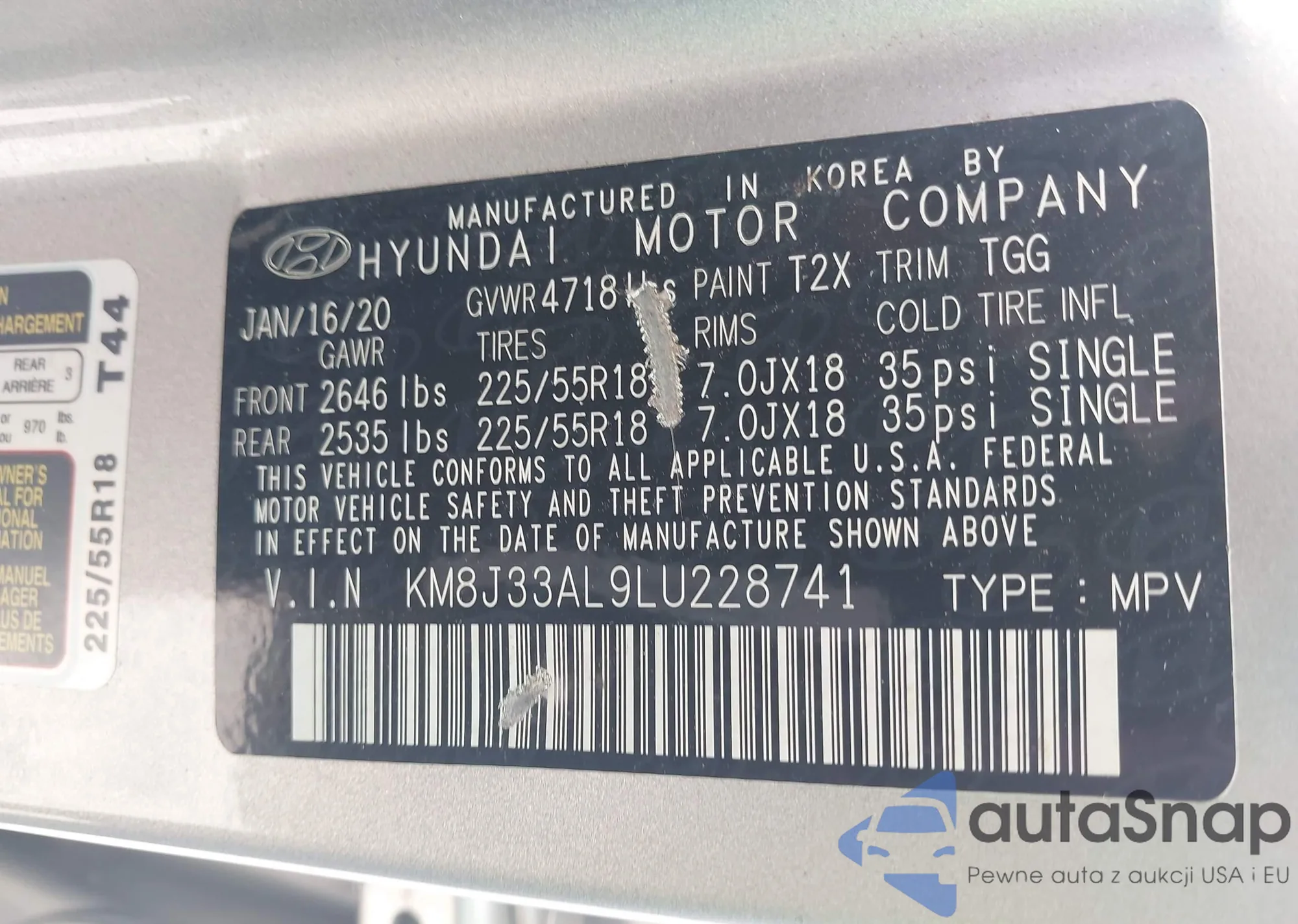 • VIN KM8J33AL9LU228741