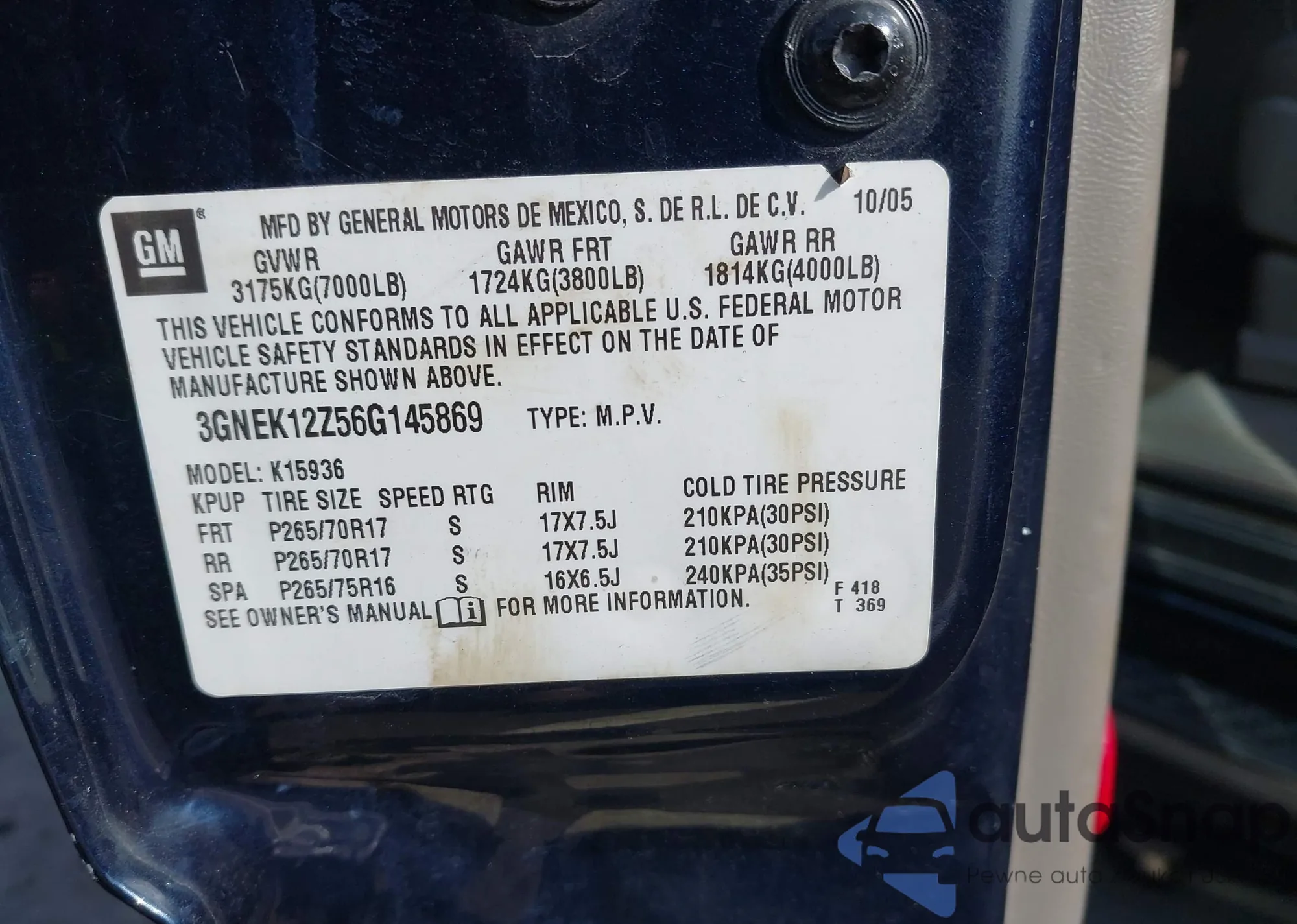• VIN 3GNEK12Z56G145869