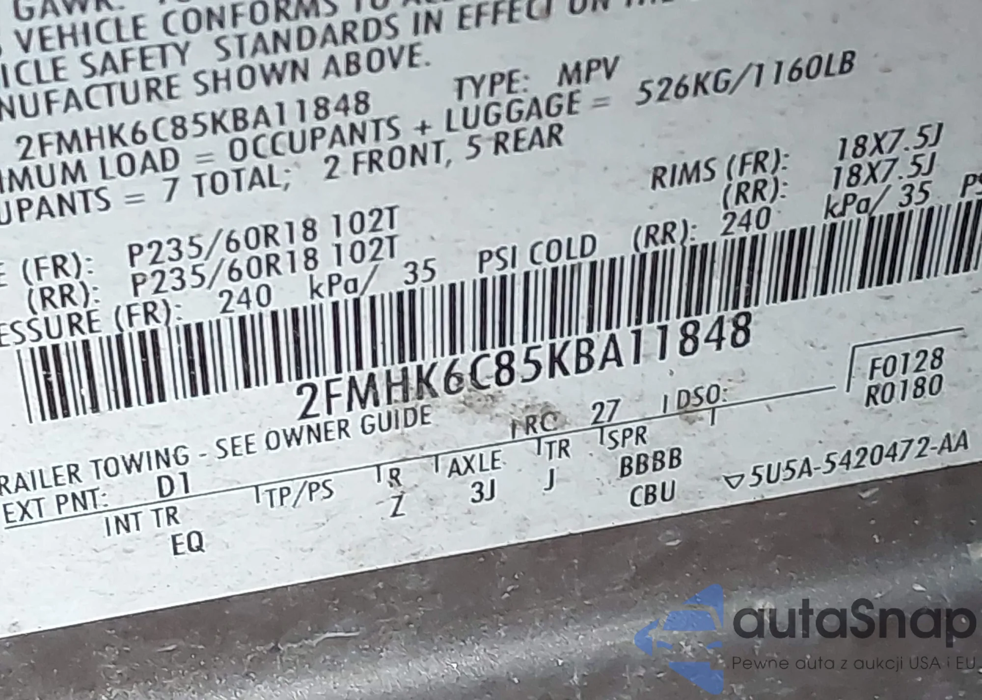 • VIN 2FMHK6C85KBA11848