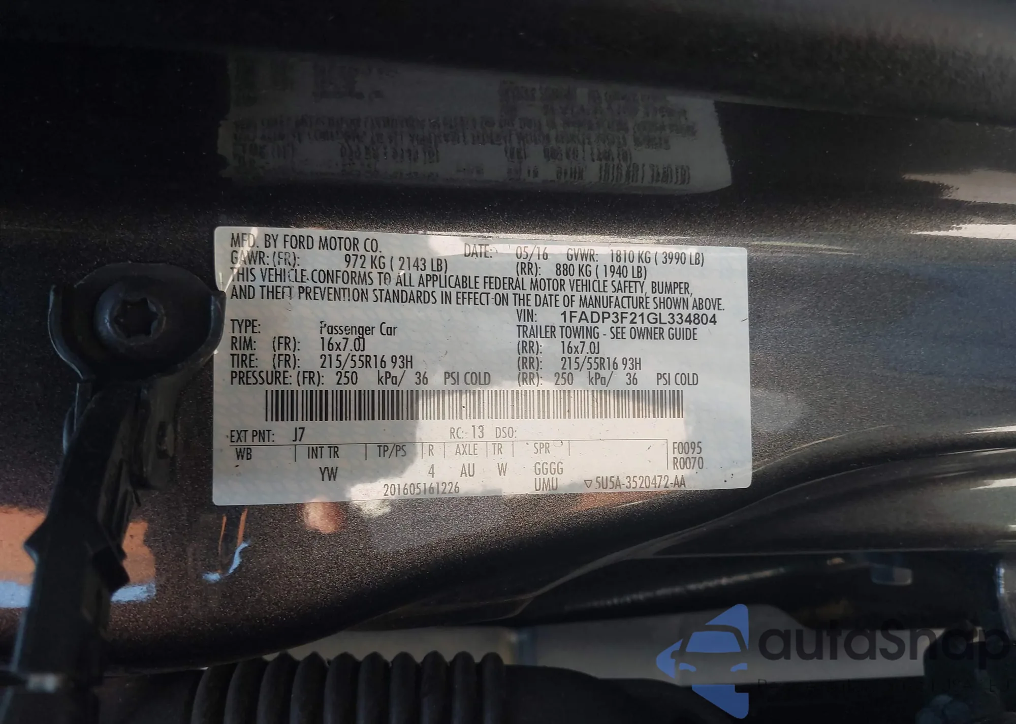 LOT: 42844155 VIN: 1FADP3F21GL334804