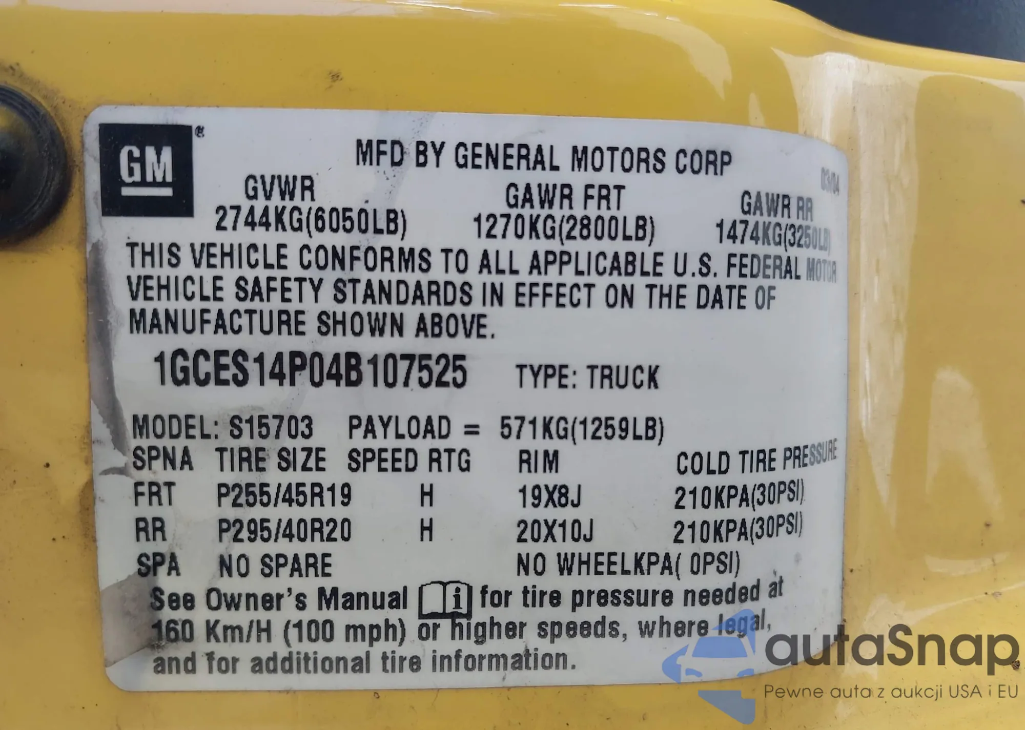 • VIN 1GCES14P04B107525