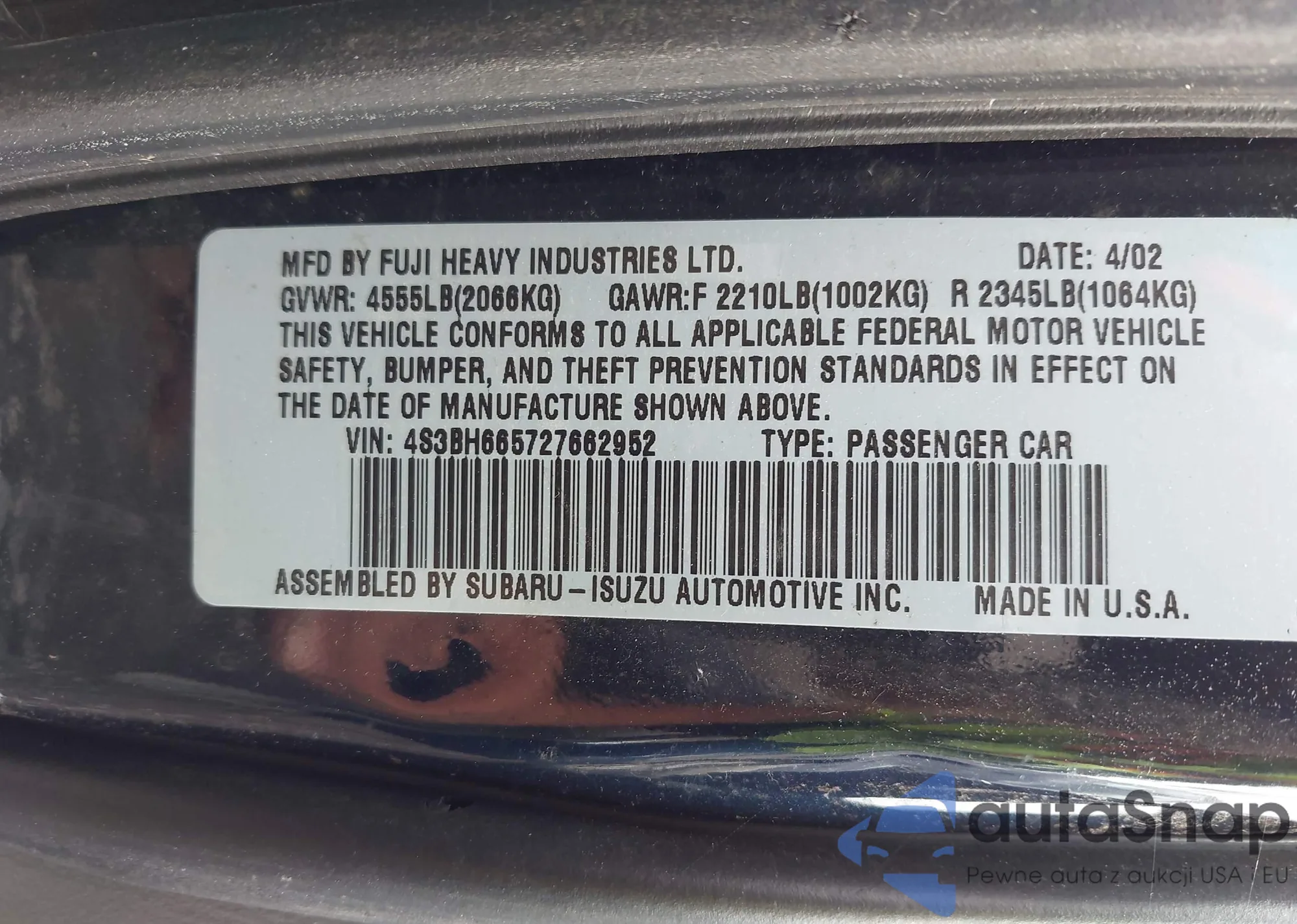 LOT: 43265414 VIN: 4S3BL626777203148