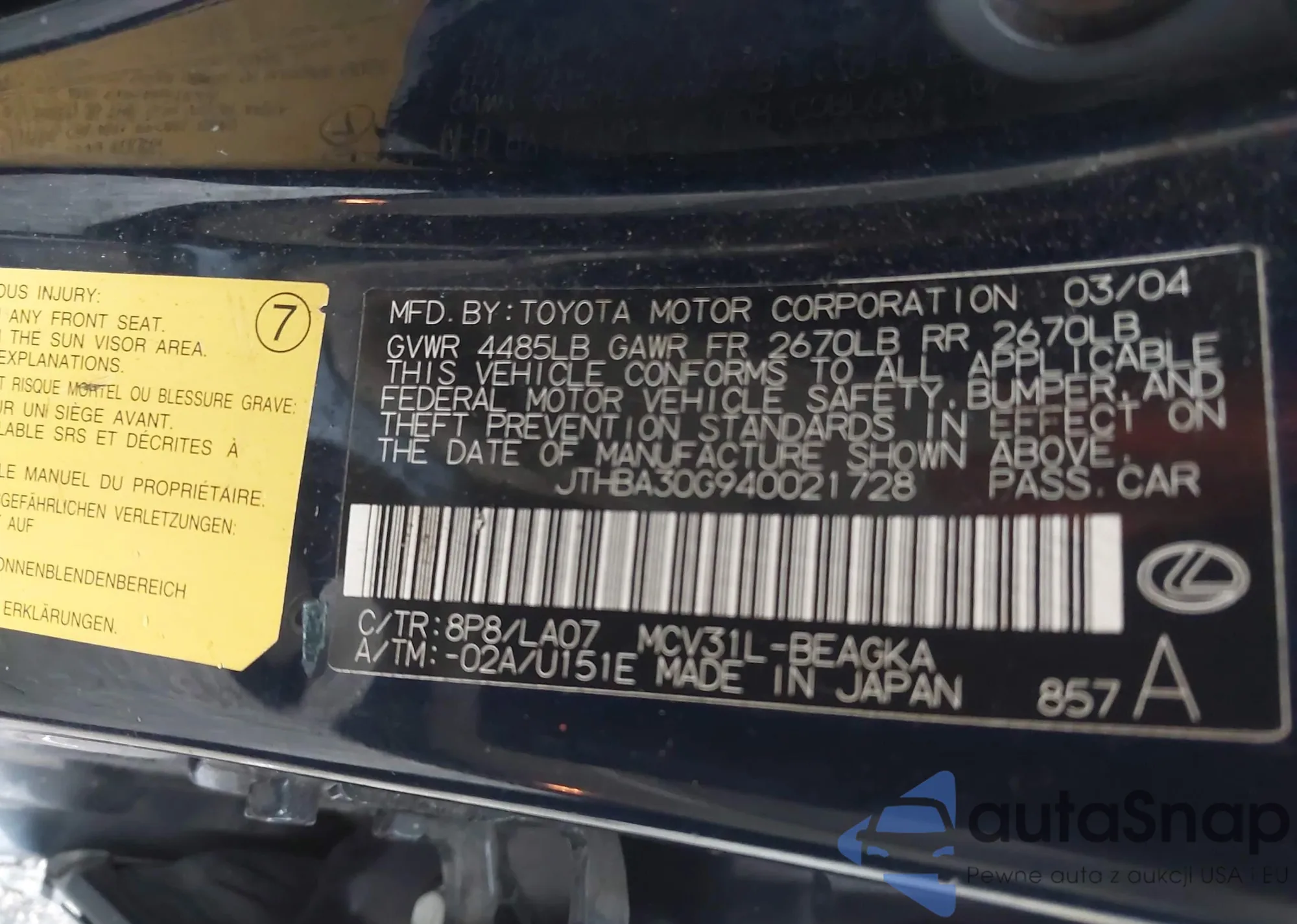 LOT: 43234051 VIN: 1FAFP33PX4W121241