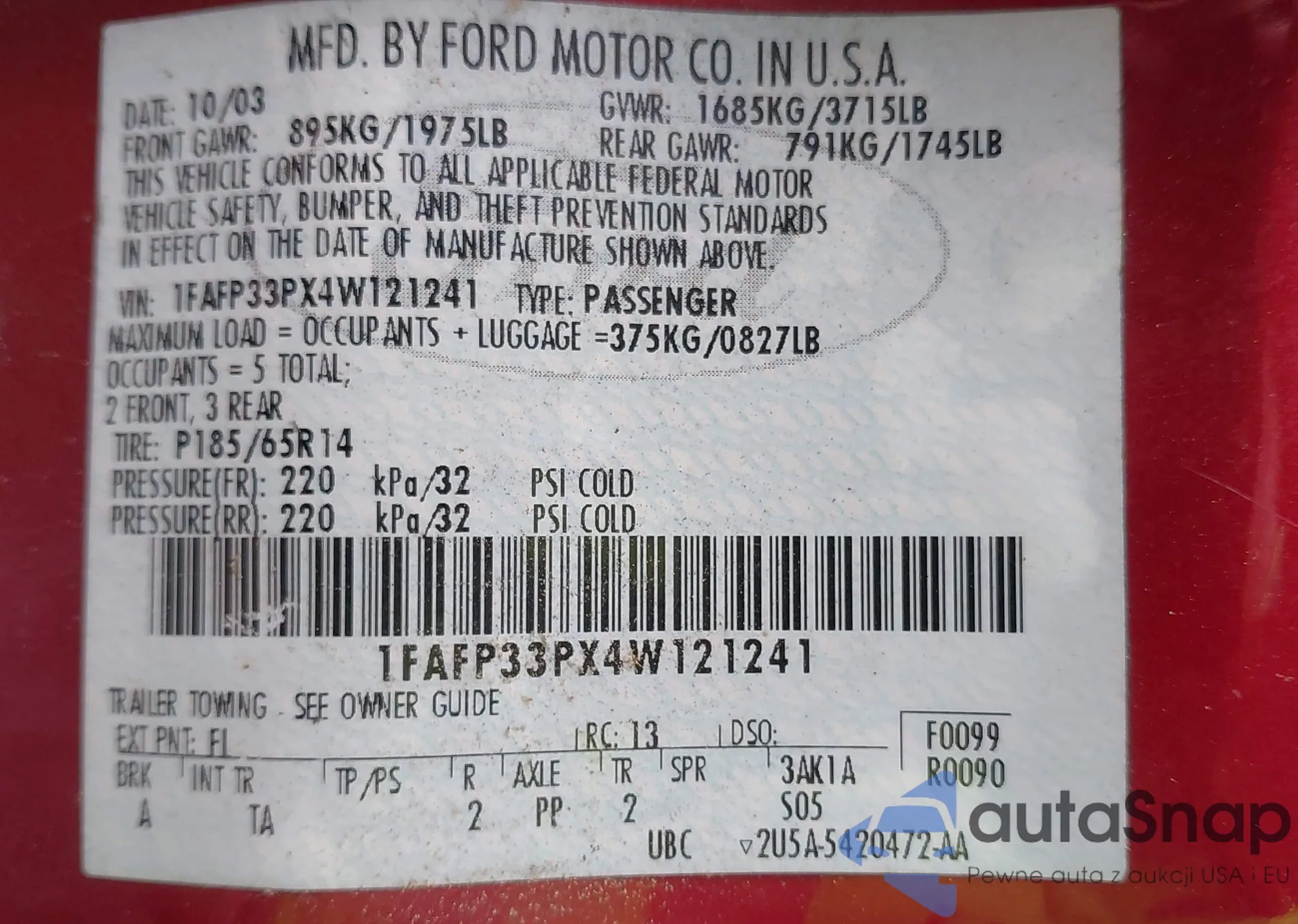 • VIN 1FAFP33PX4W121241