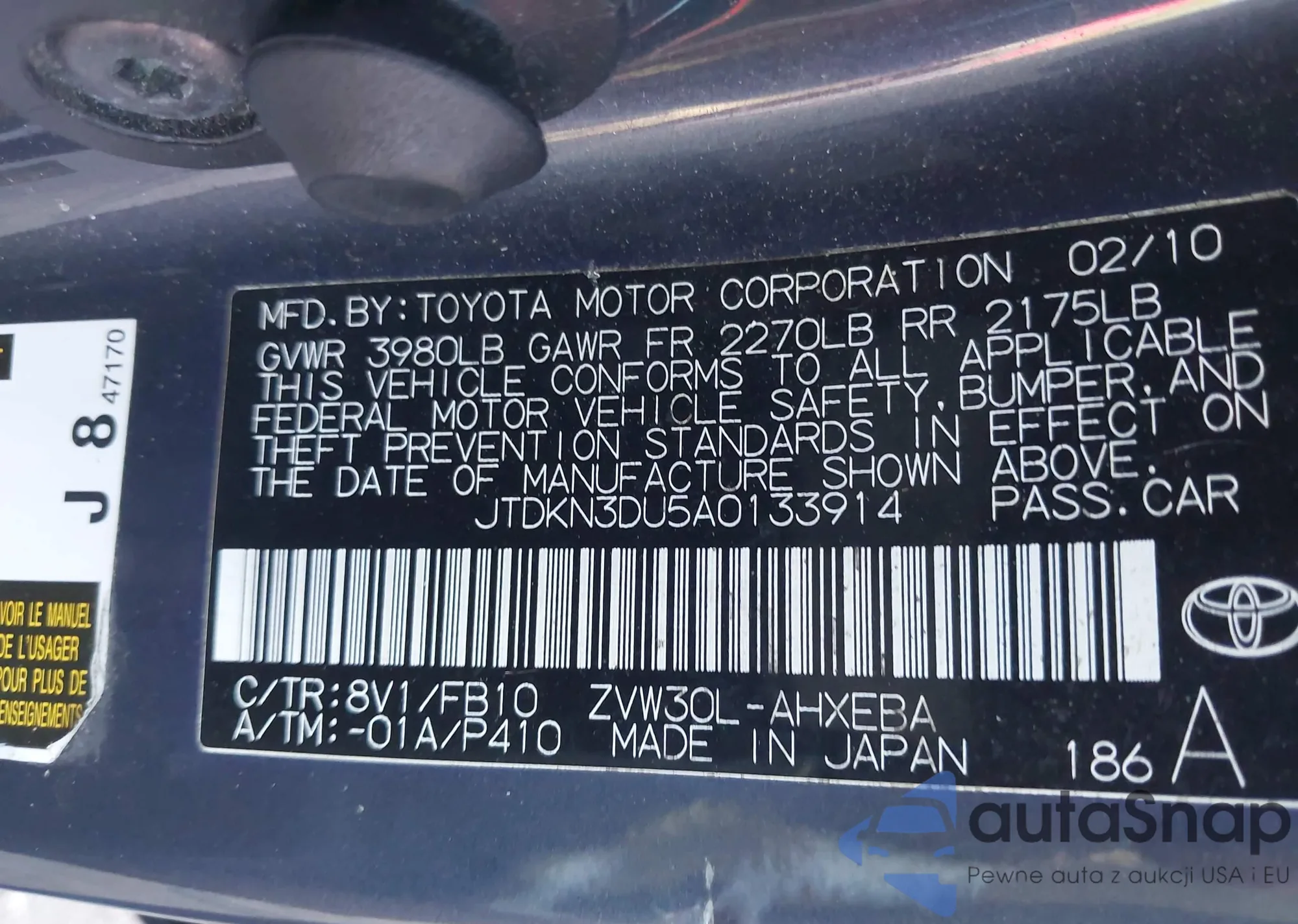 LOT: 43106883 VIN: JTDKN3DU0D5585681