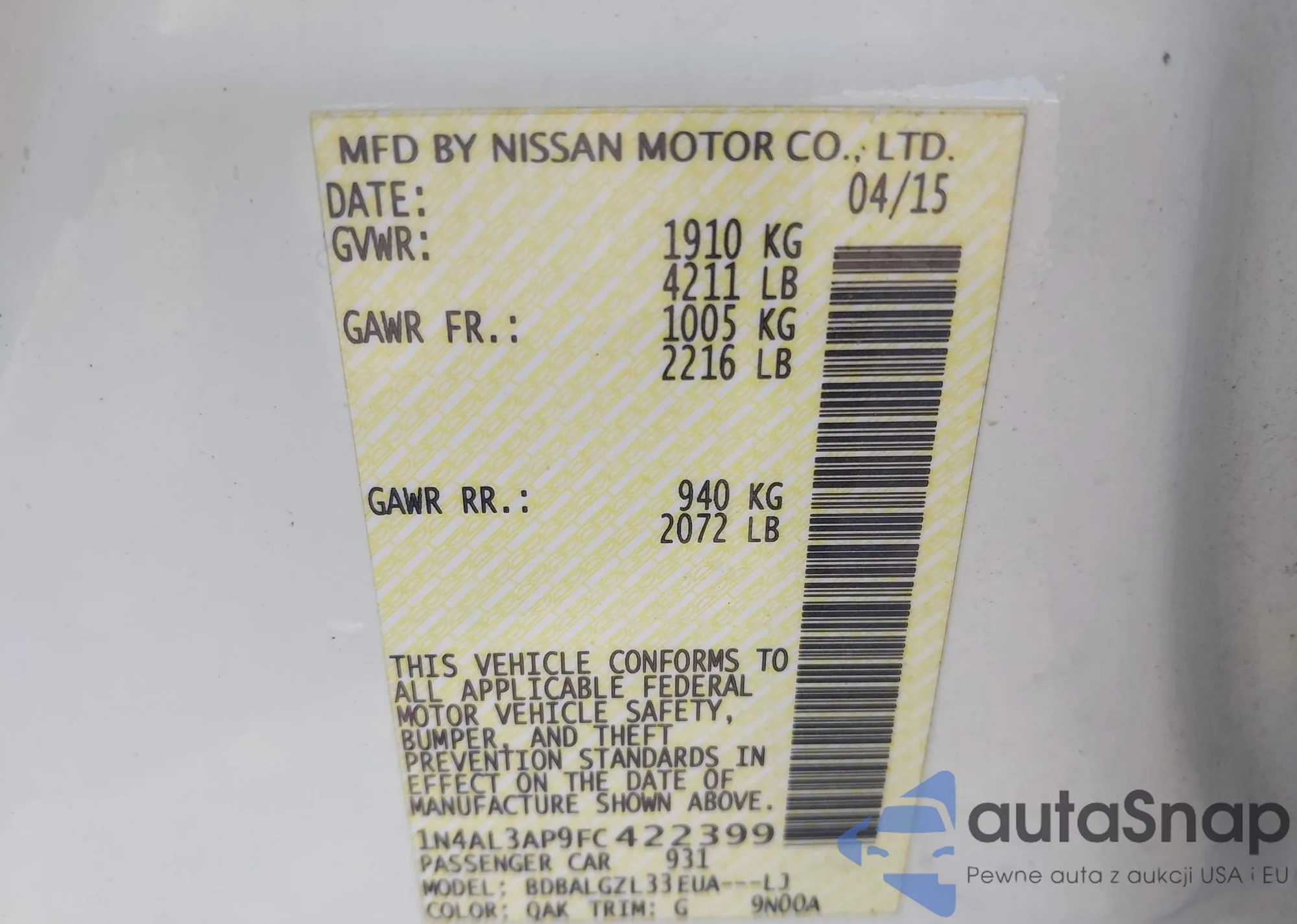 LOT: 43218160 VIN: 1N4AL3AP9FC422399
