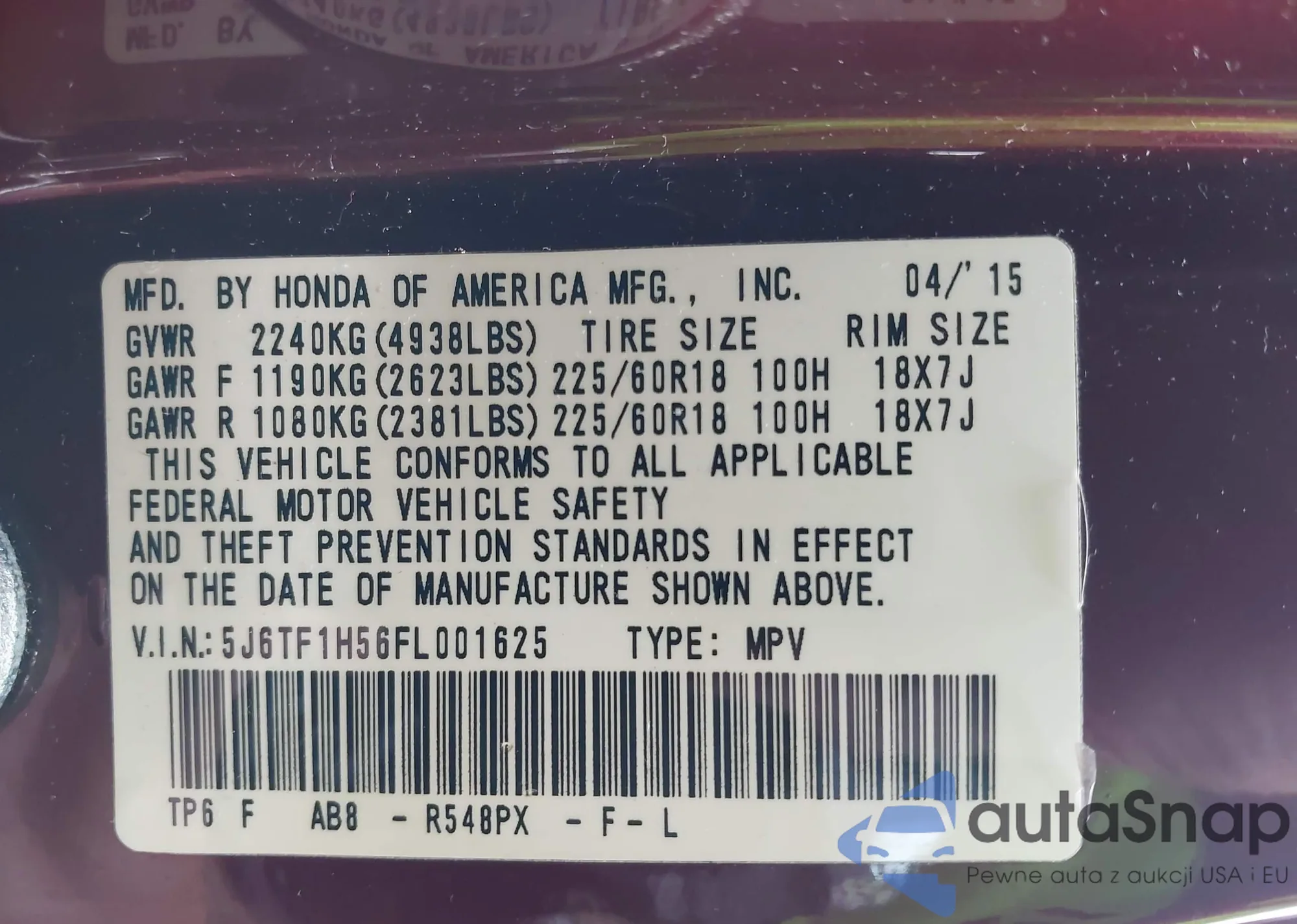 • VIN 5J6TF1H56FL001625