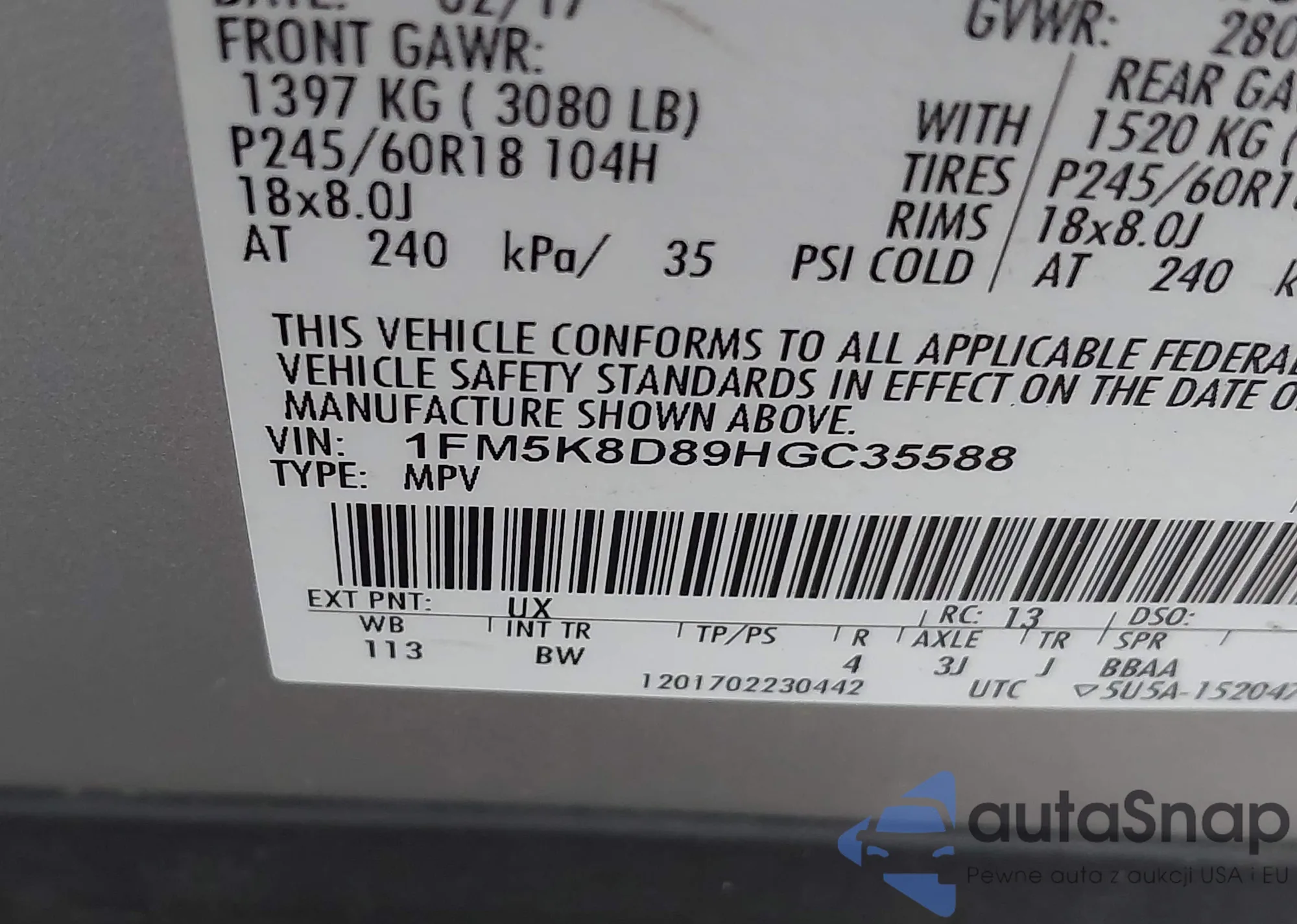 LOT: 43252189 VIN: 1FM5K8D89HGC35588