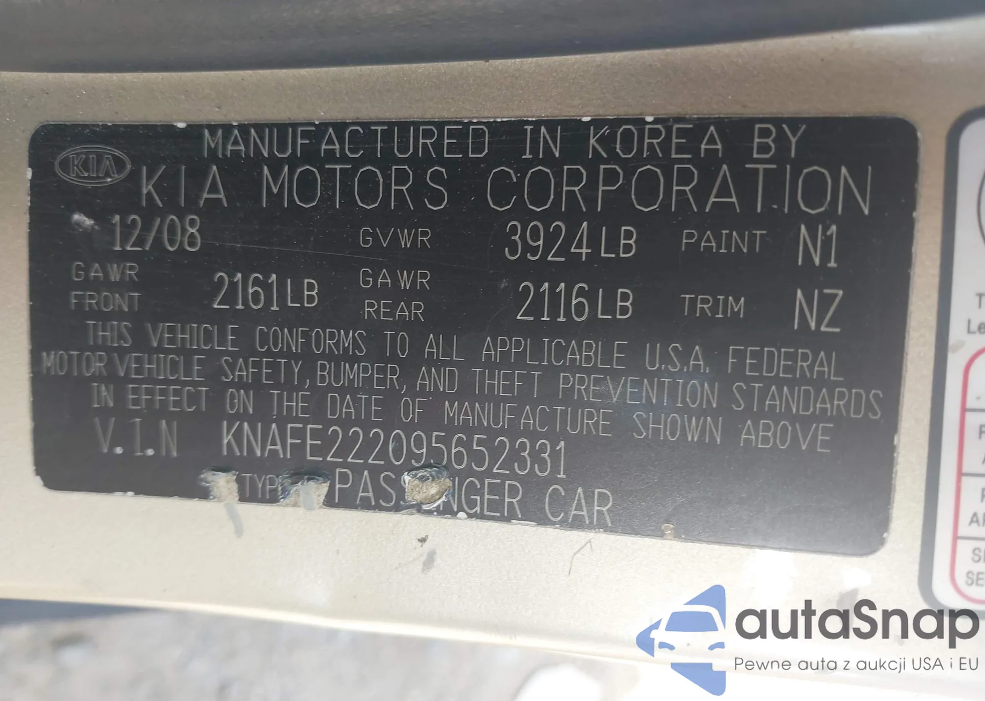 LOT: 42792801 VIN: KNAFE222095652331