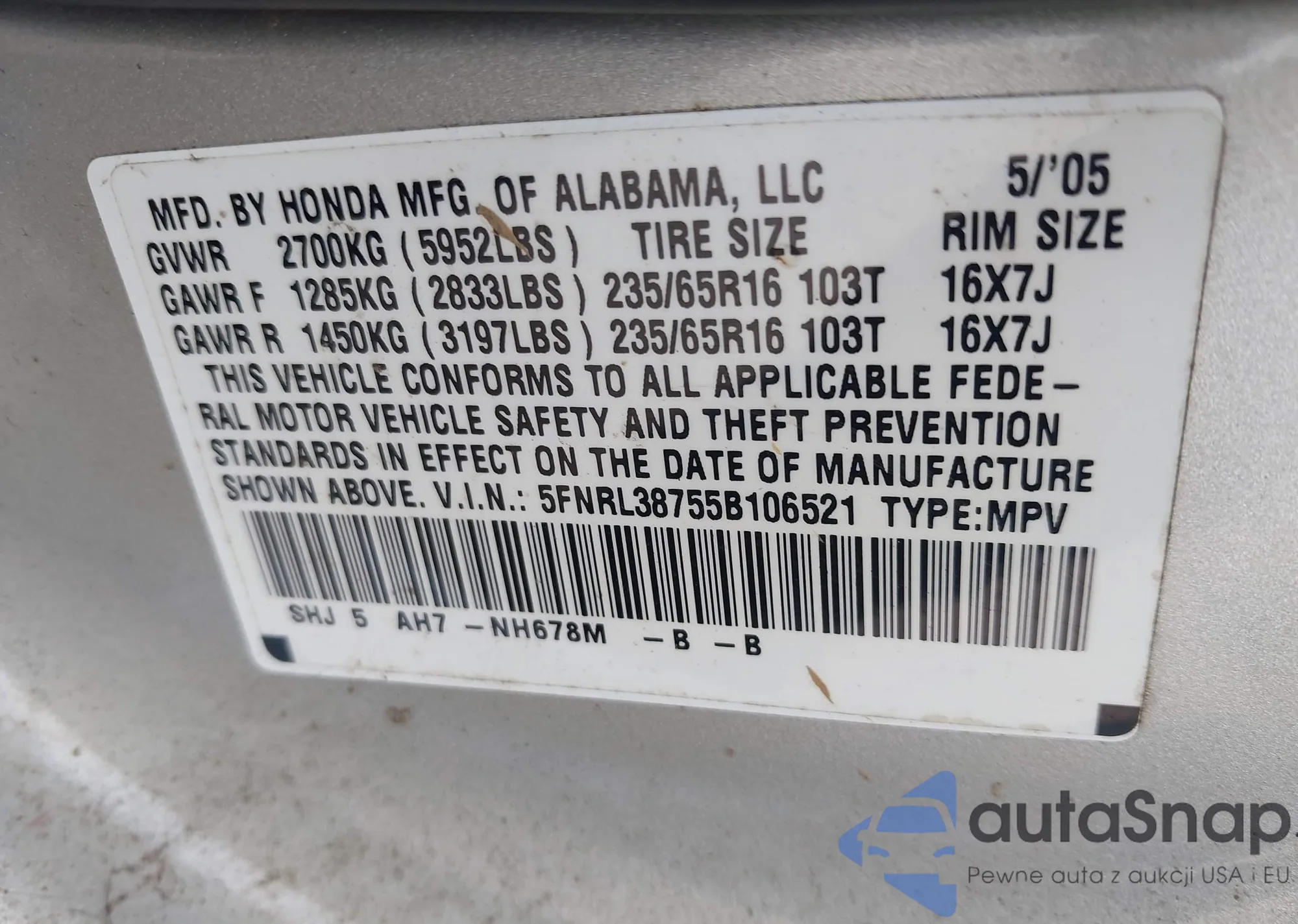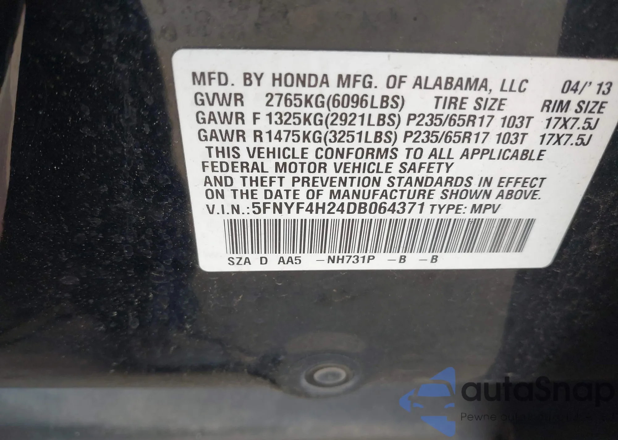• VIN 5FNRL3H7XAB043071