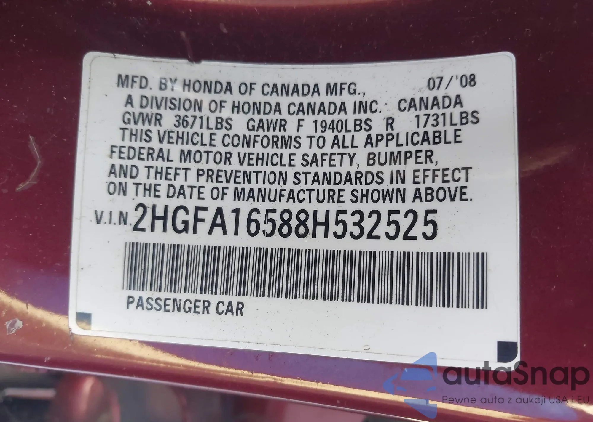 LOT: 43269160 VIN: 2HGFA16588H532525