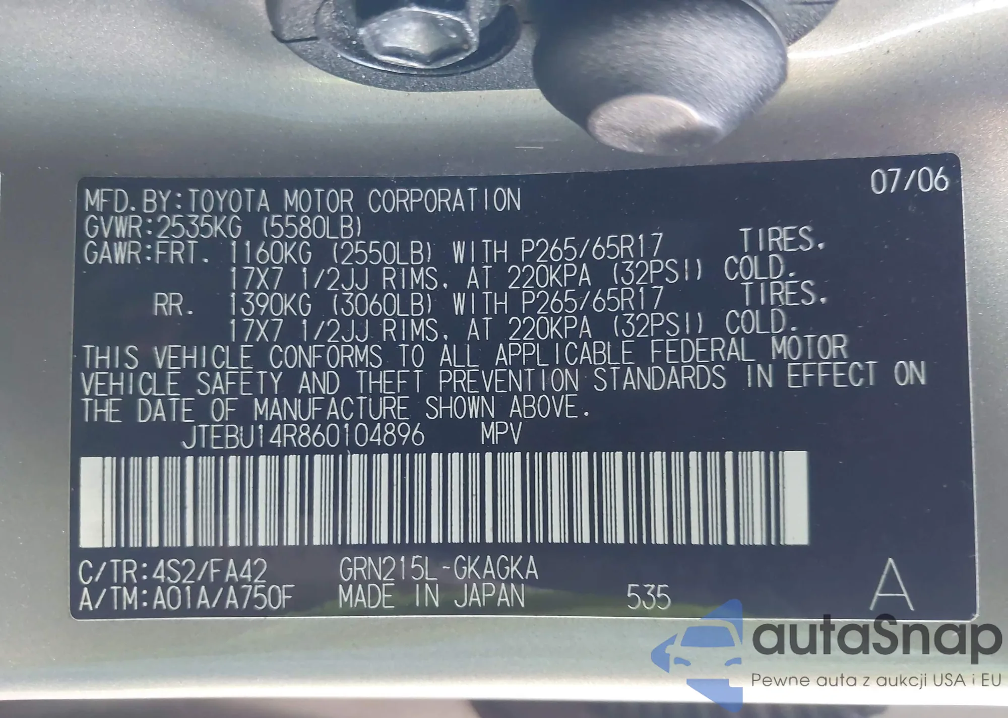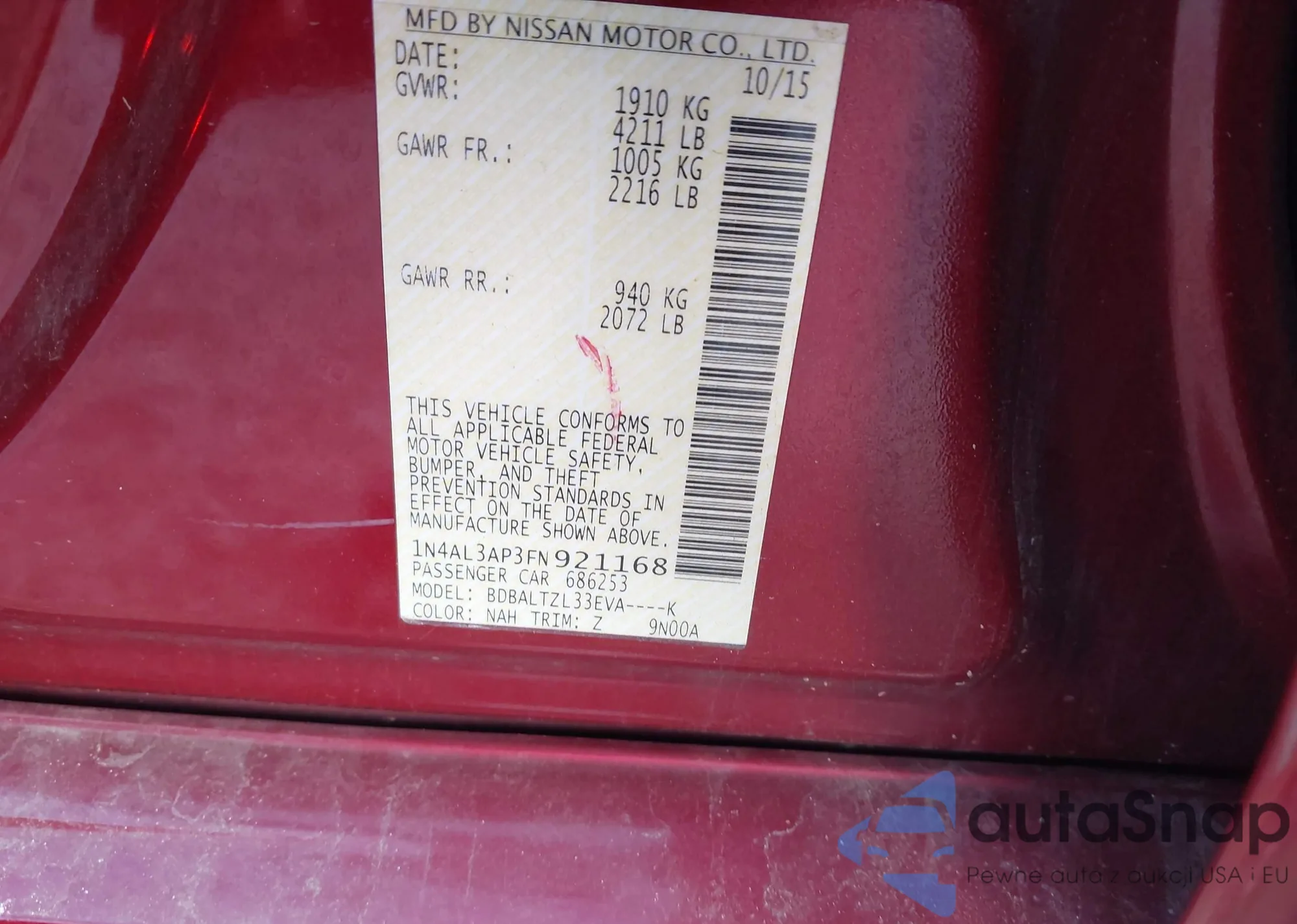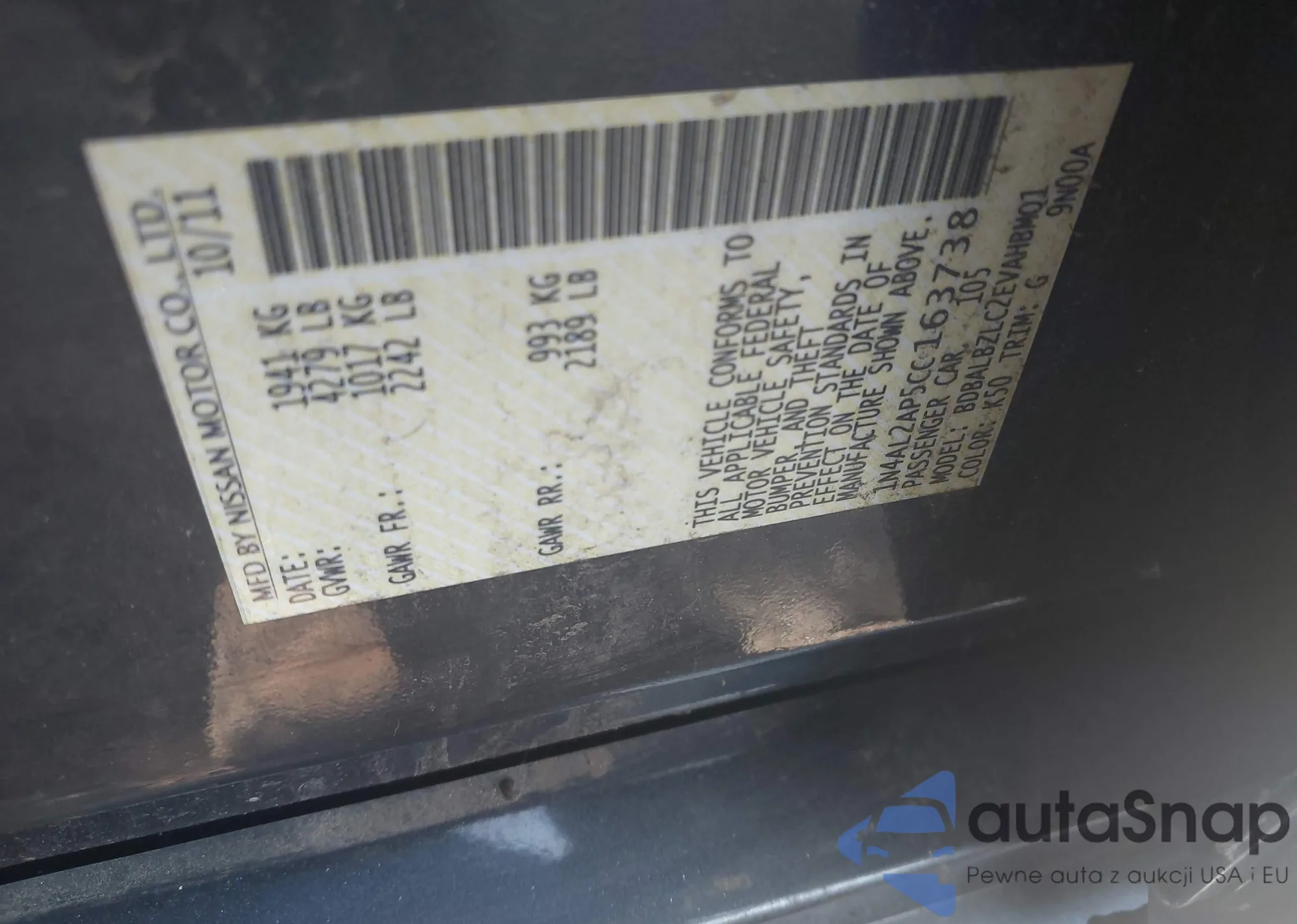 LOT: 43340505 VIN: 1N4AL2AP5CC163738