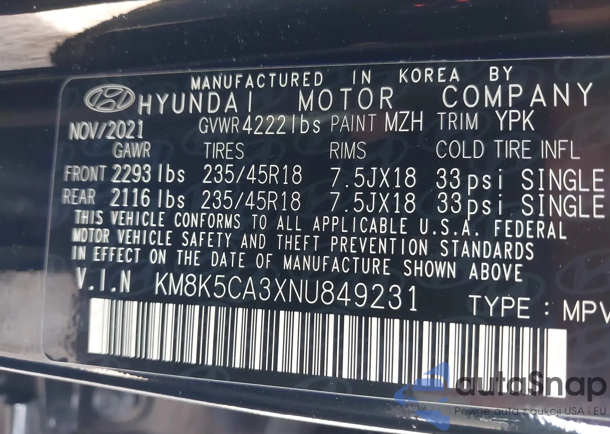 • VIN KM8K5CA3XNU849231