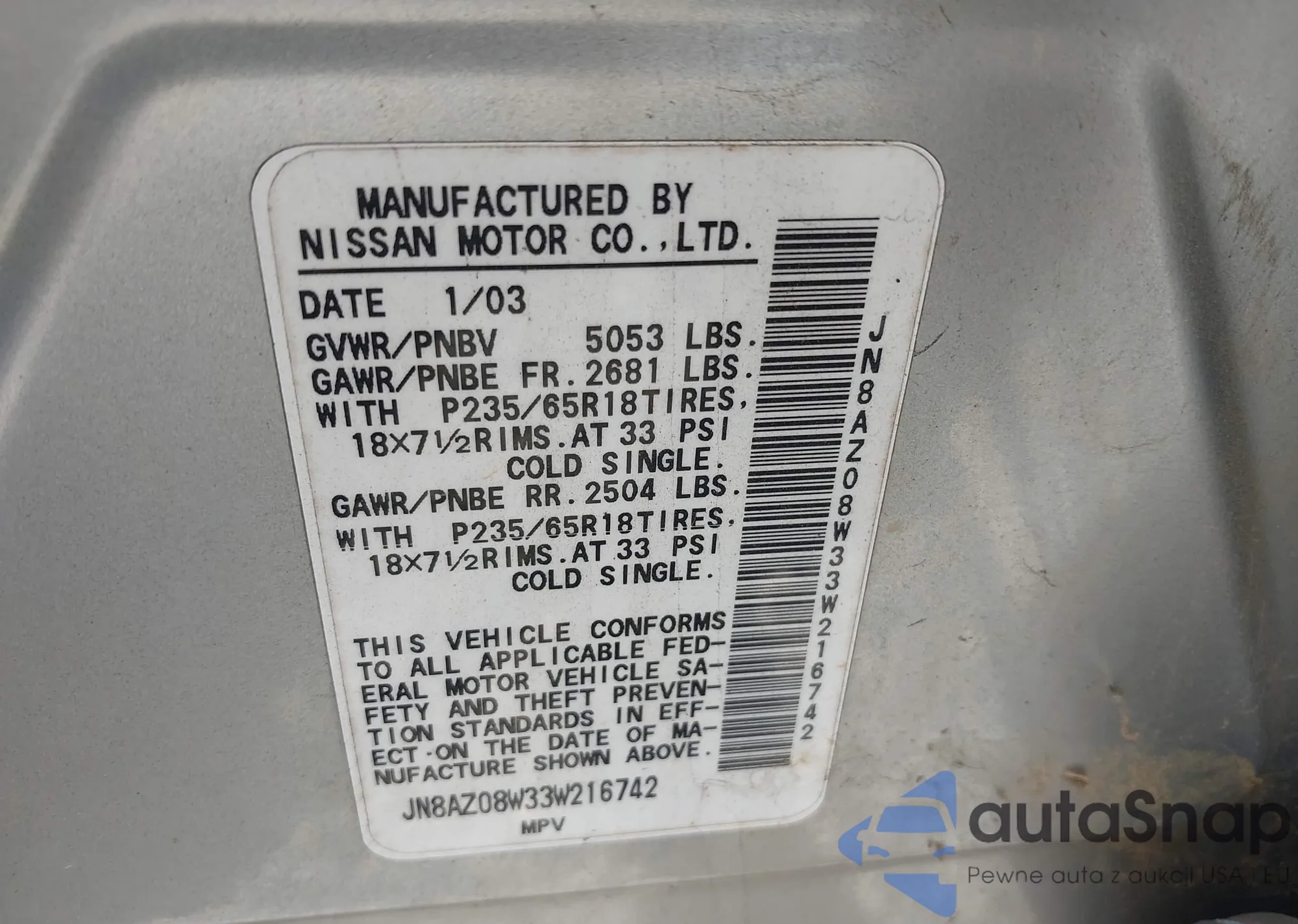LOT: 43198853 VIN: JN8AZ08W33W216742