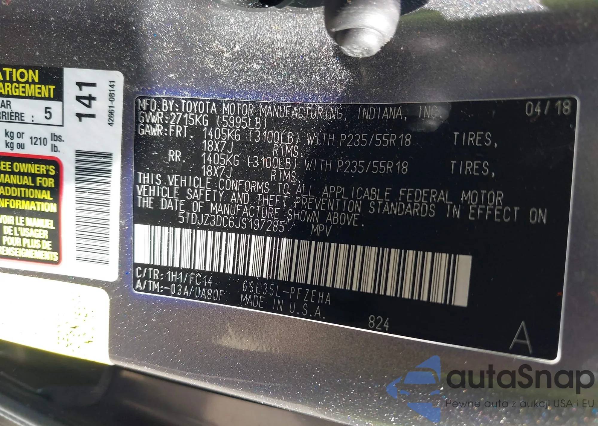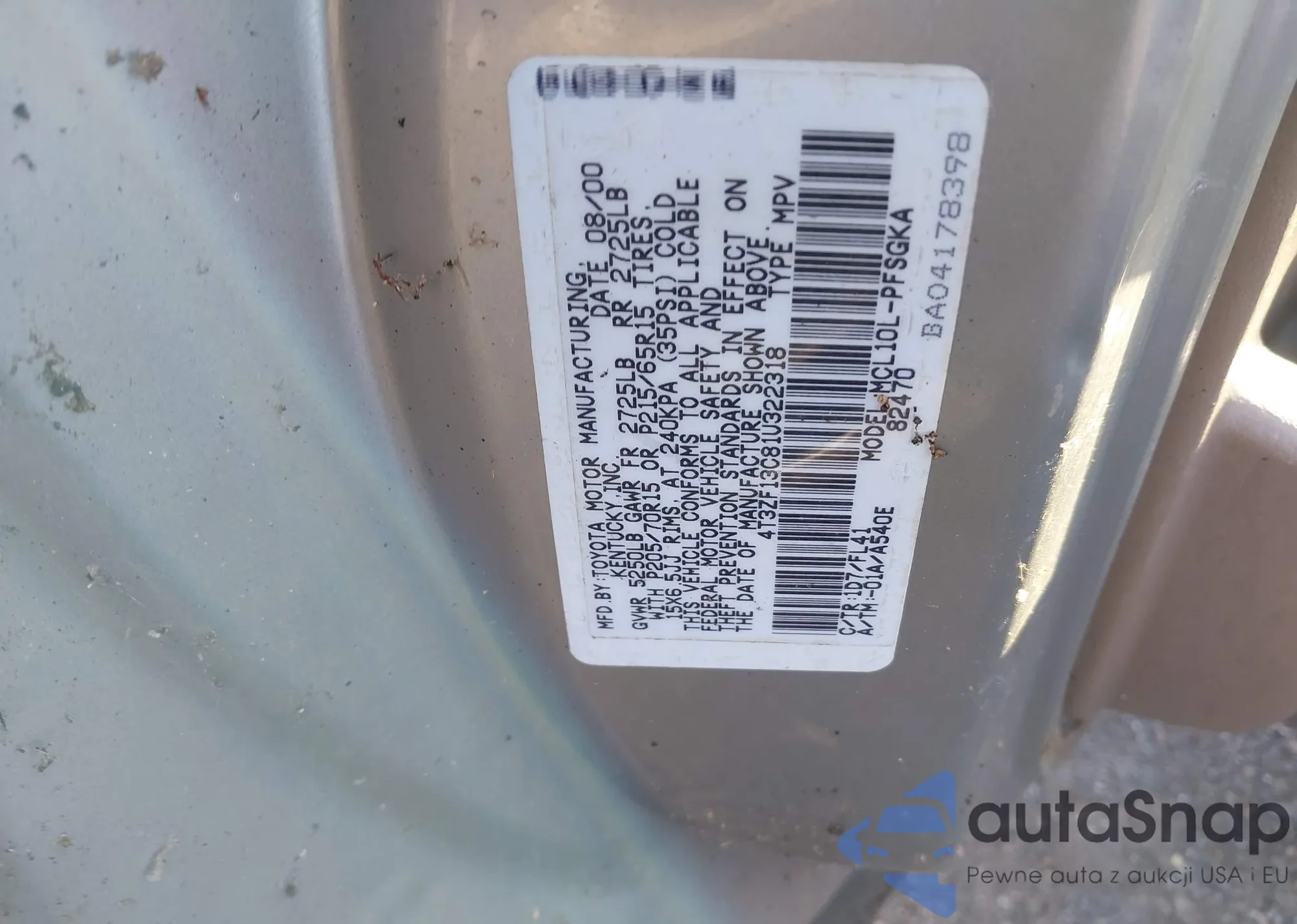 • VIN 4T3ZF13C81U322318