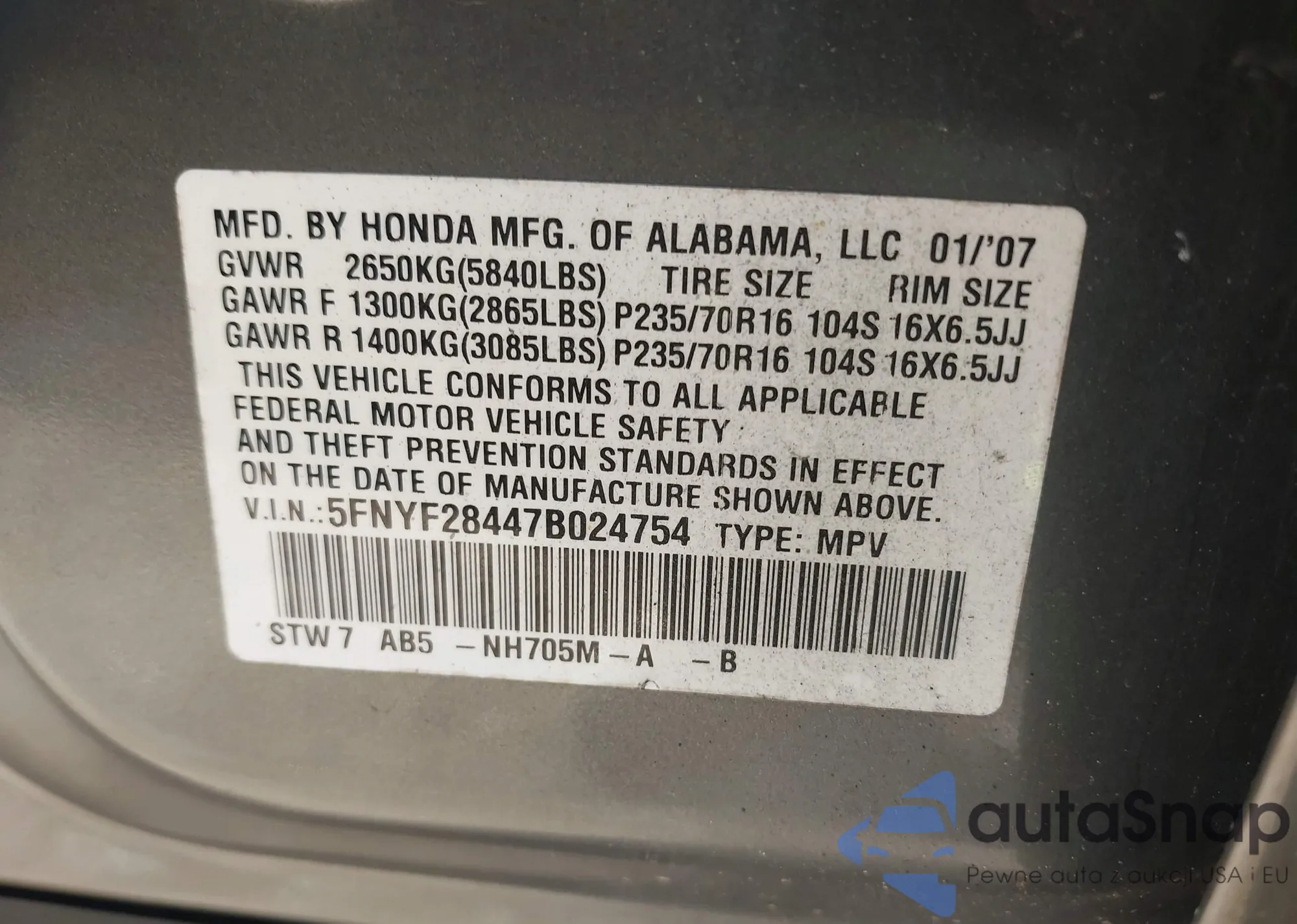 LOT: 43172116 VIN: 5FNYF28447B024754