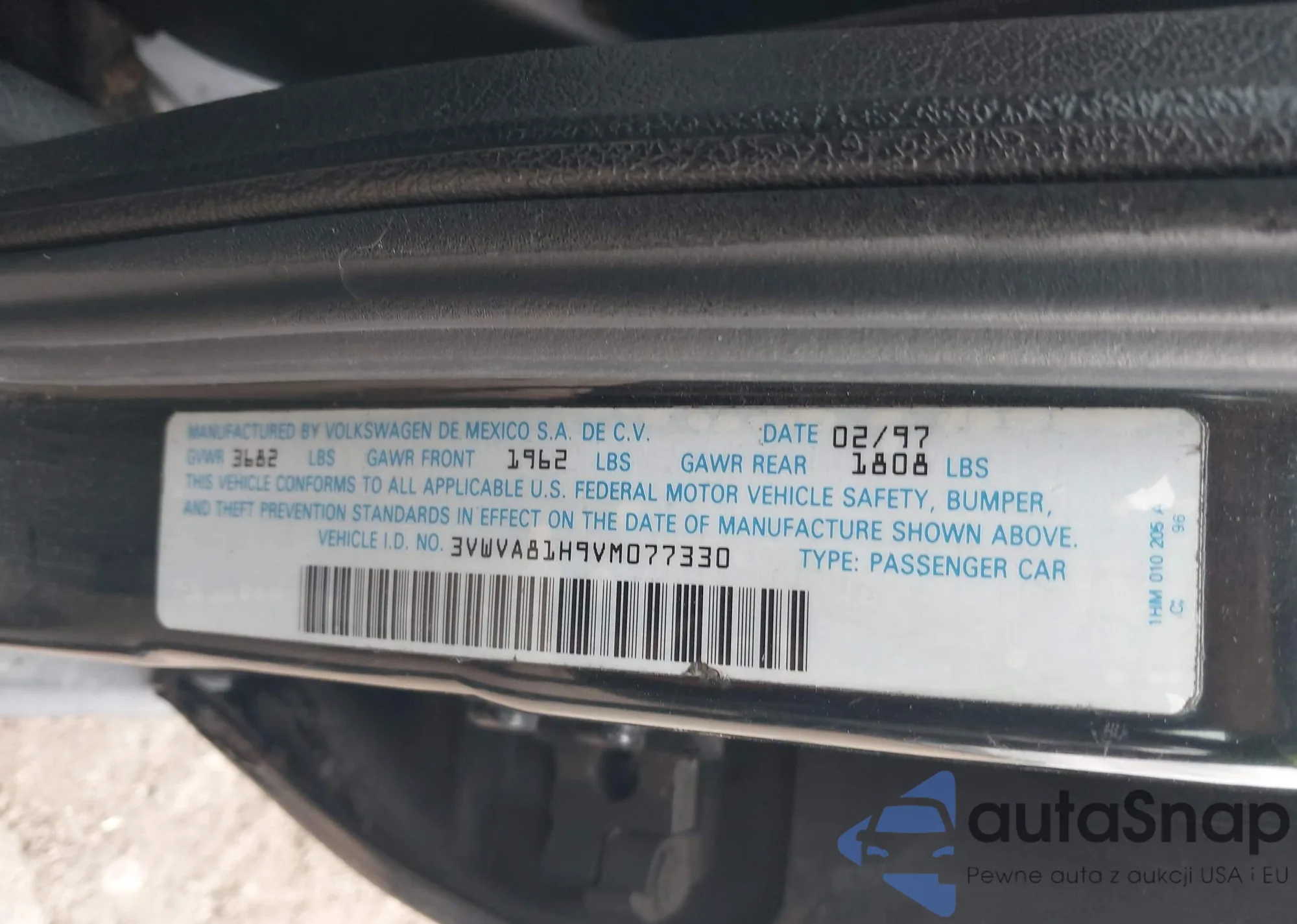 • VIN 3VWVA81H9VM077330