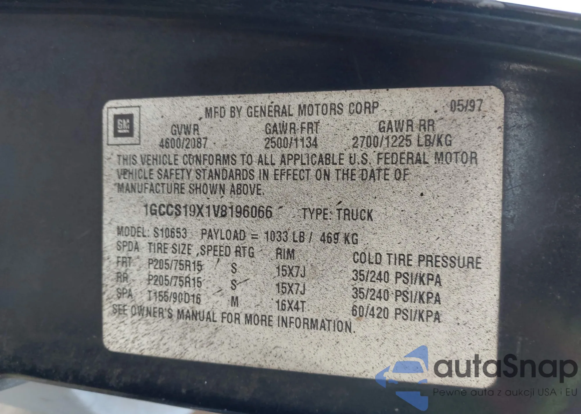 LOT: 43338109 VIN: 1GCCS19X1V8196066