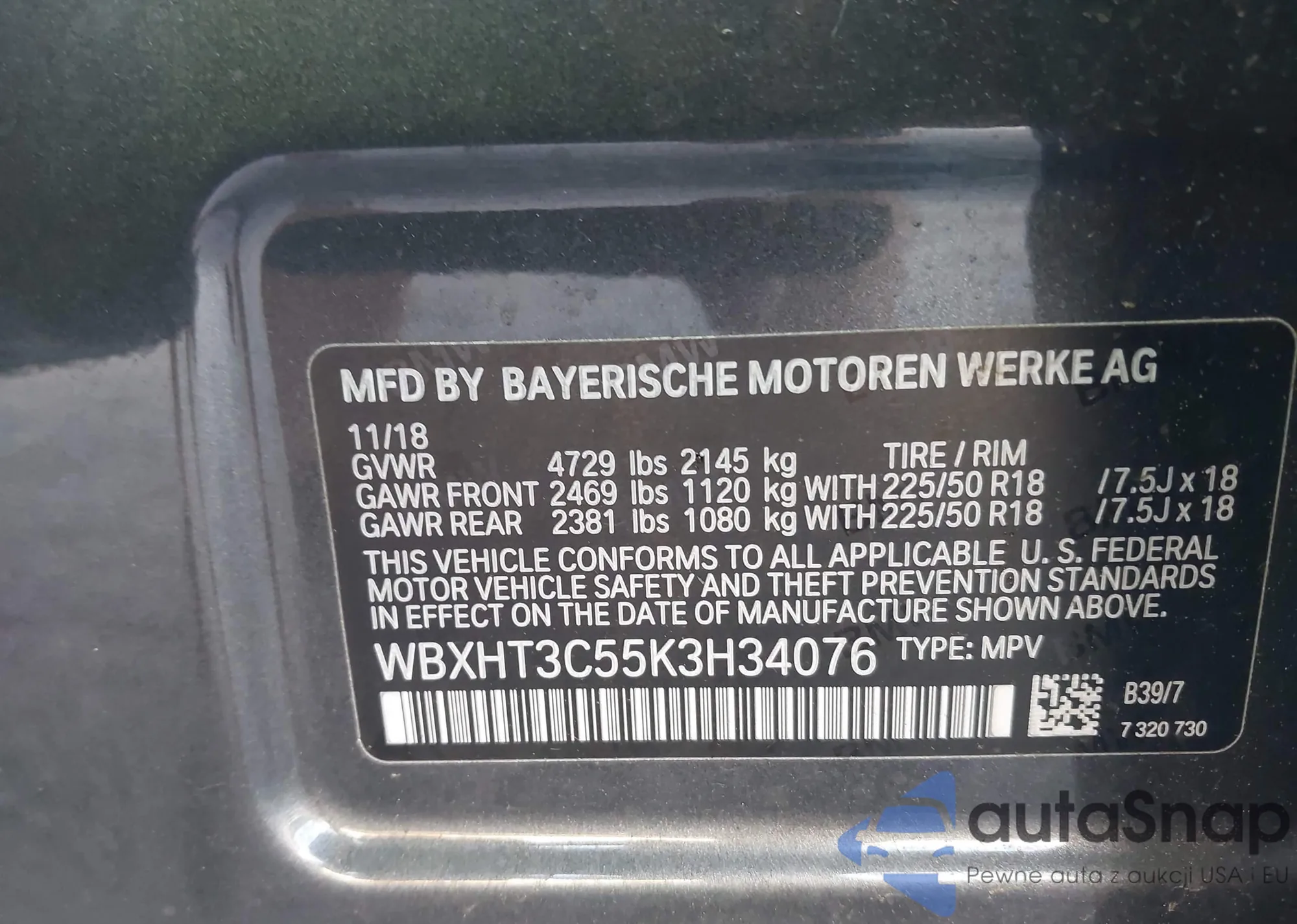 LOT: 42824346 VIN: WBXHT3C55K3H34076