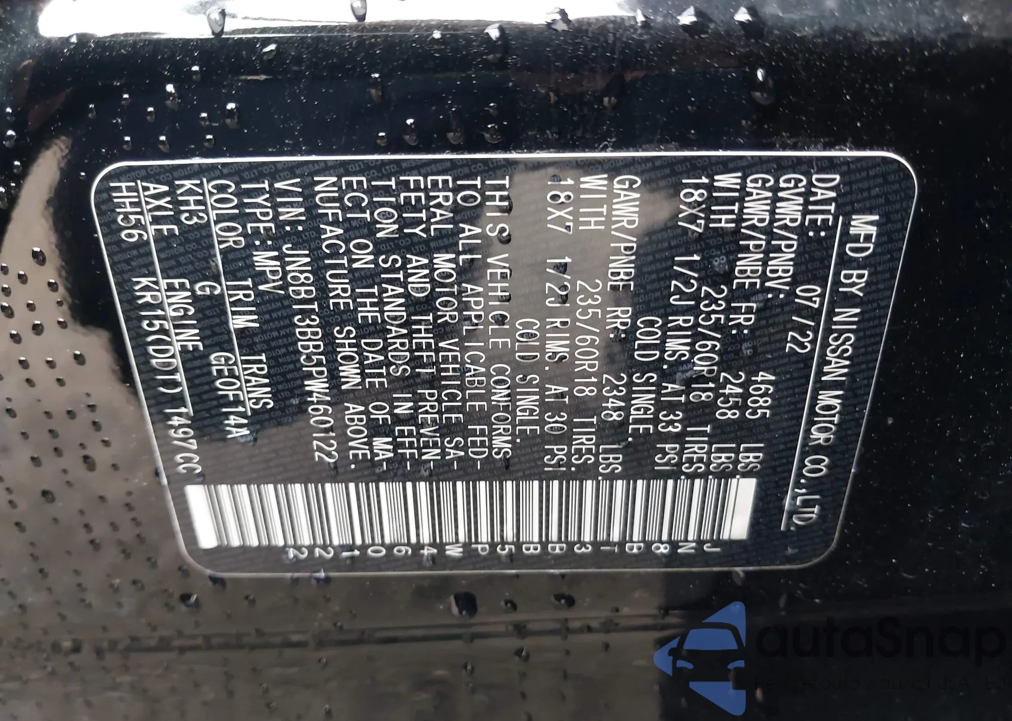 • VIN JN8BT3BB5PW460122