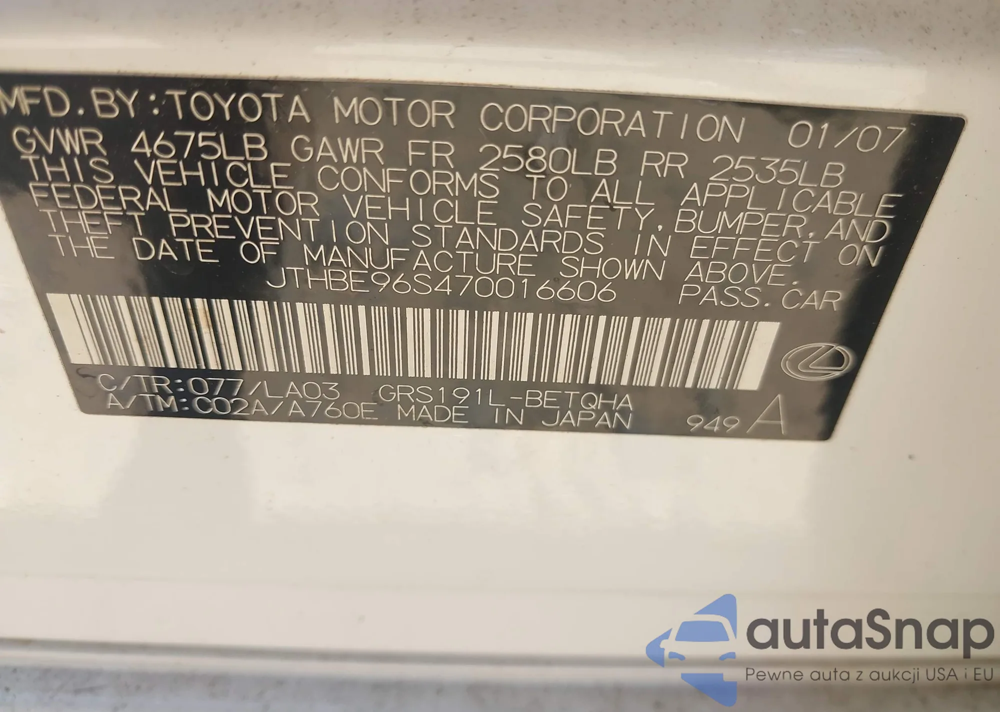 LOT: 43128389 VIN: JTHBE96S470016606