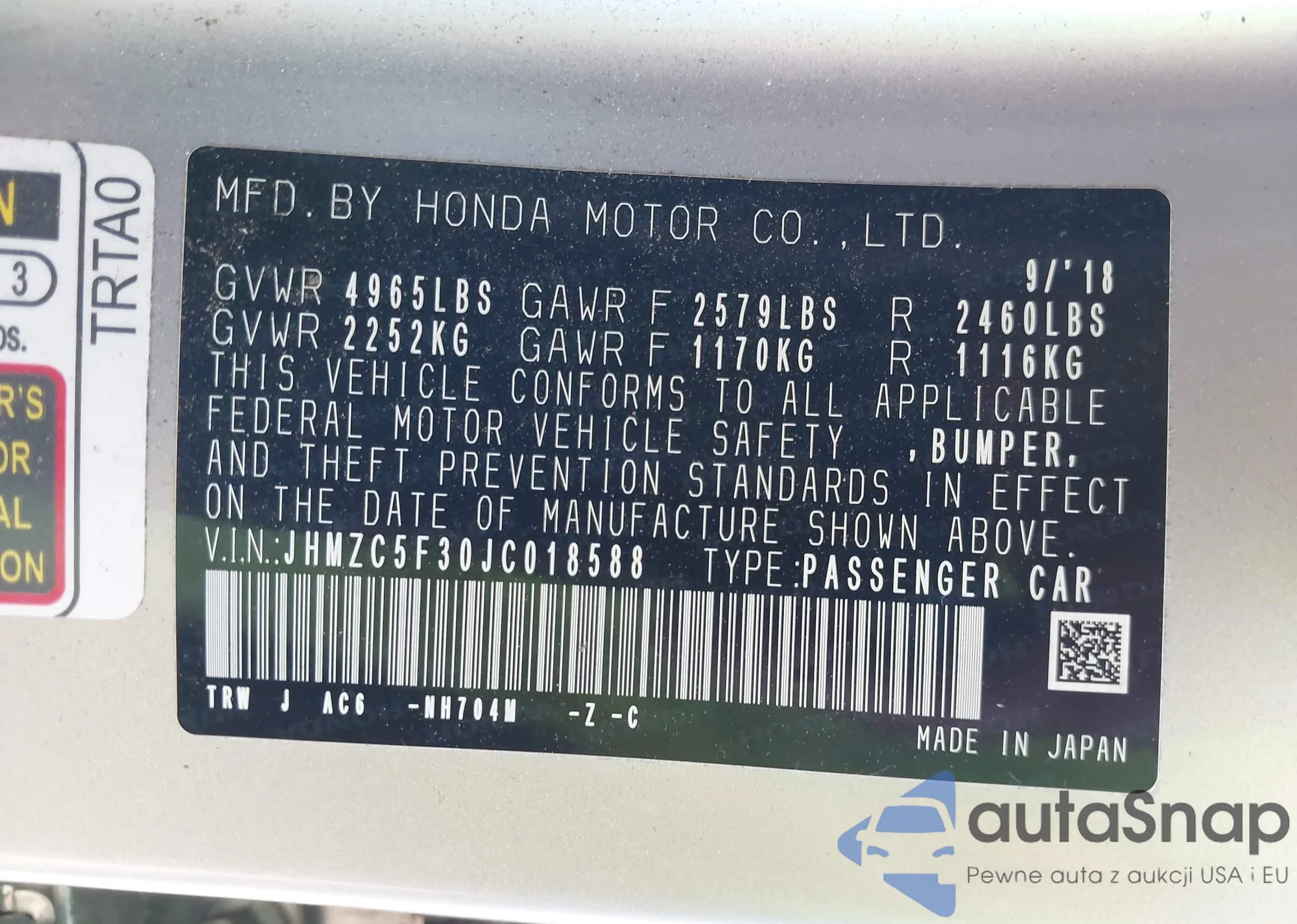 LOT: 43184306 VIN: JHMZC5F30JC018588