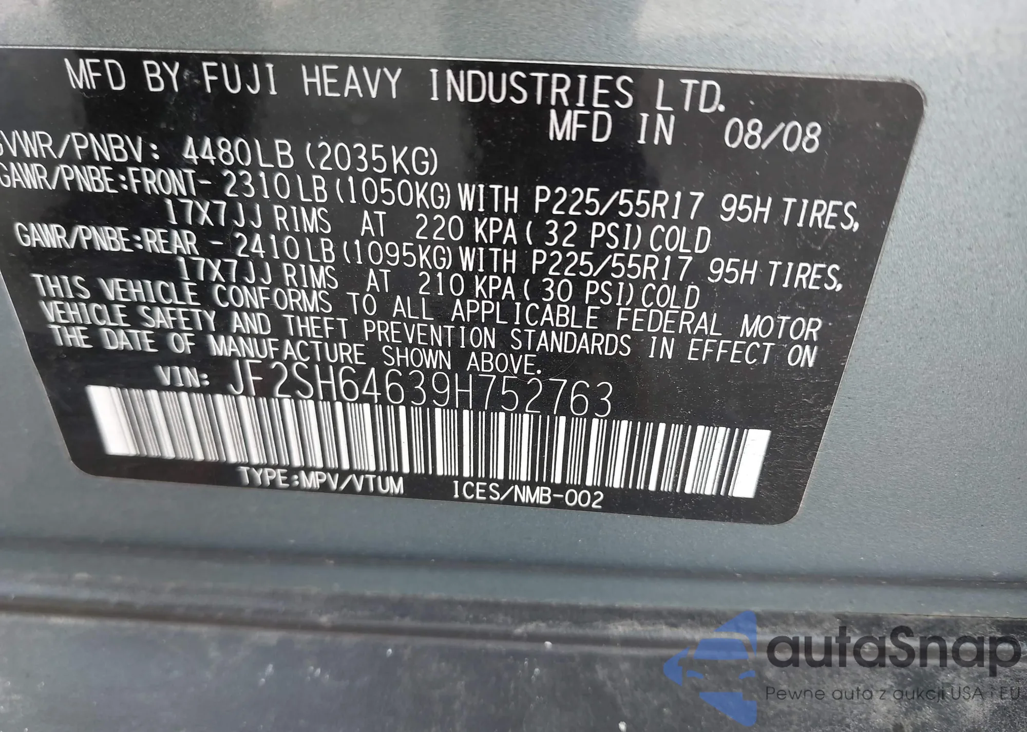 LOT: 43213494 VIN: JF2SH64639H752763