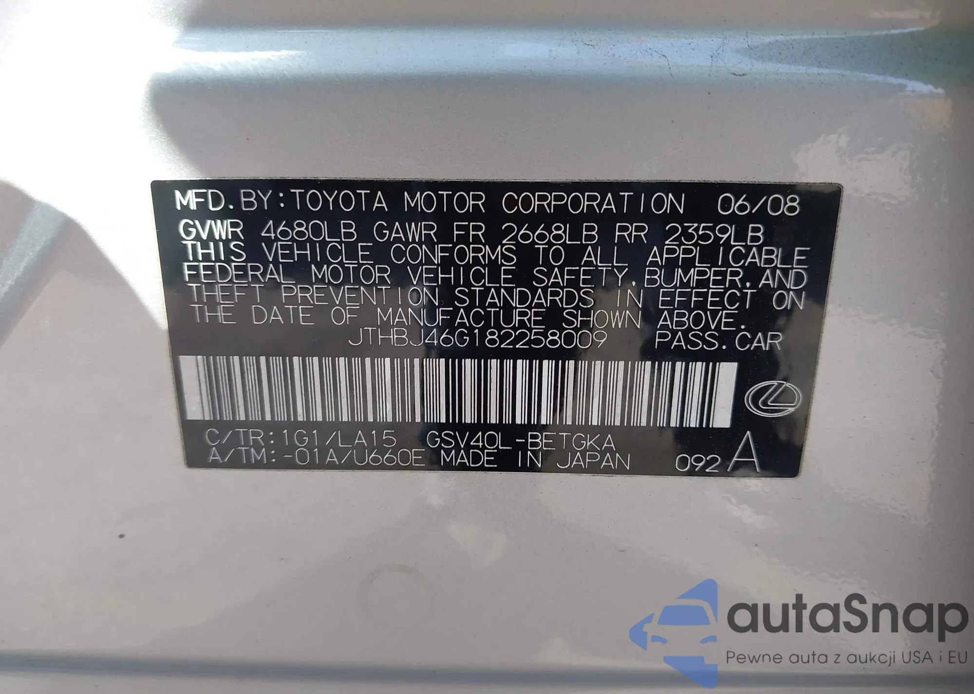 LOT: 43226865 VIN: JTHBJ46G182258009