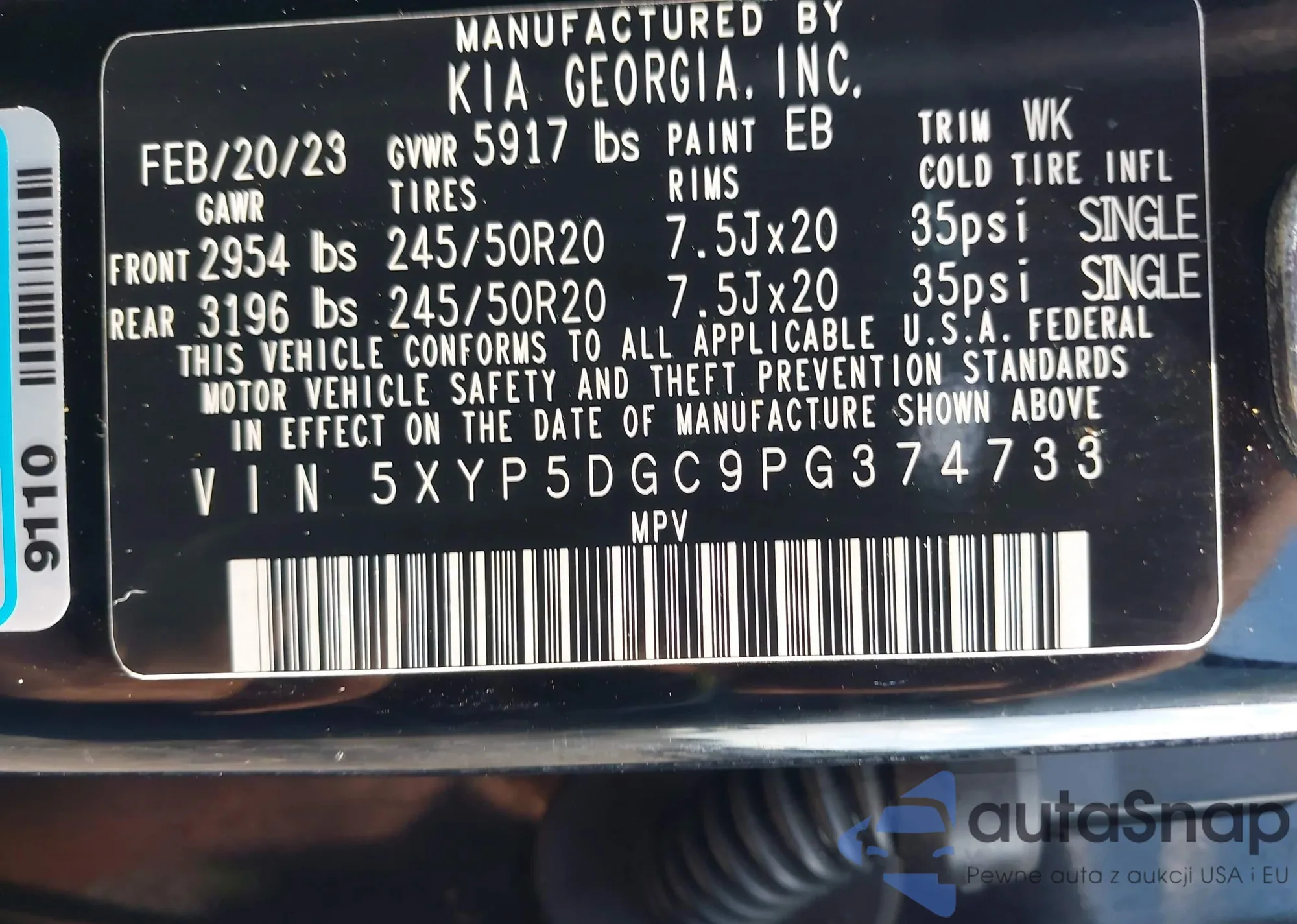 • VIN 5XYP5DGC9PG374733