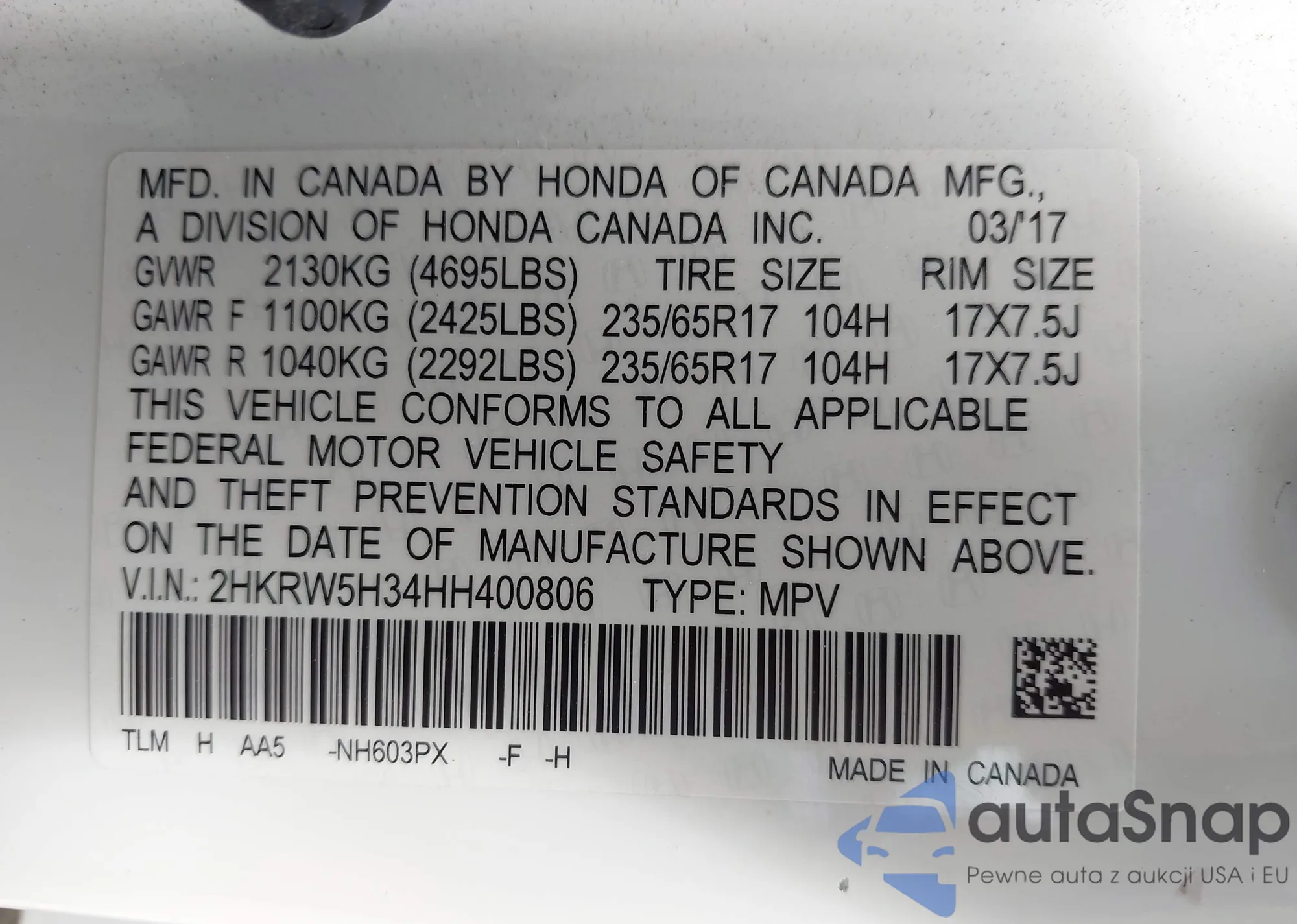 • VIN 2HKRW5H34HH400806