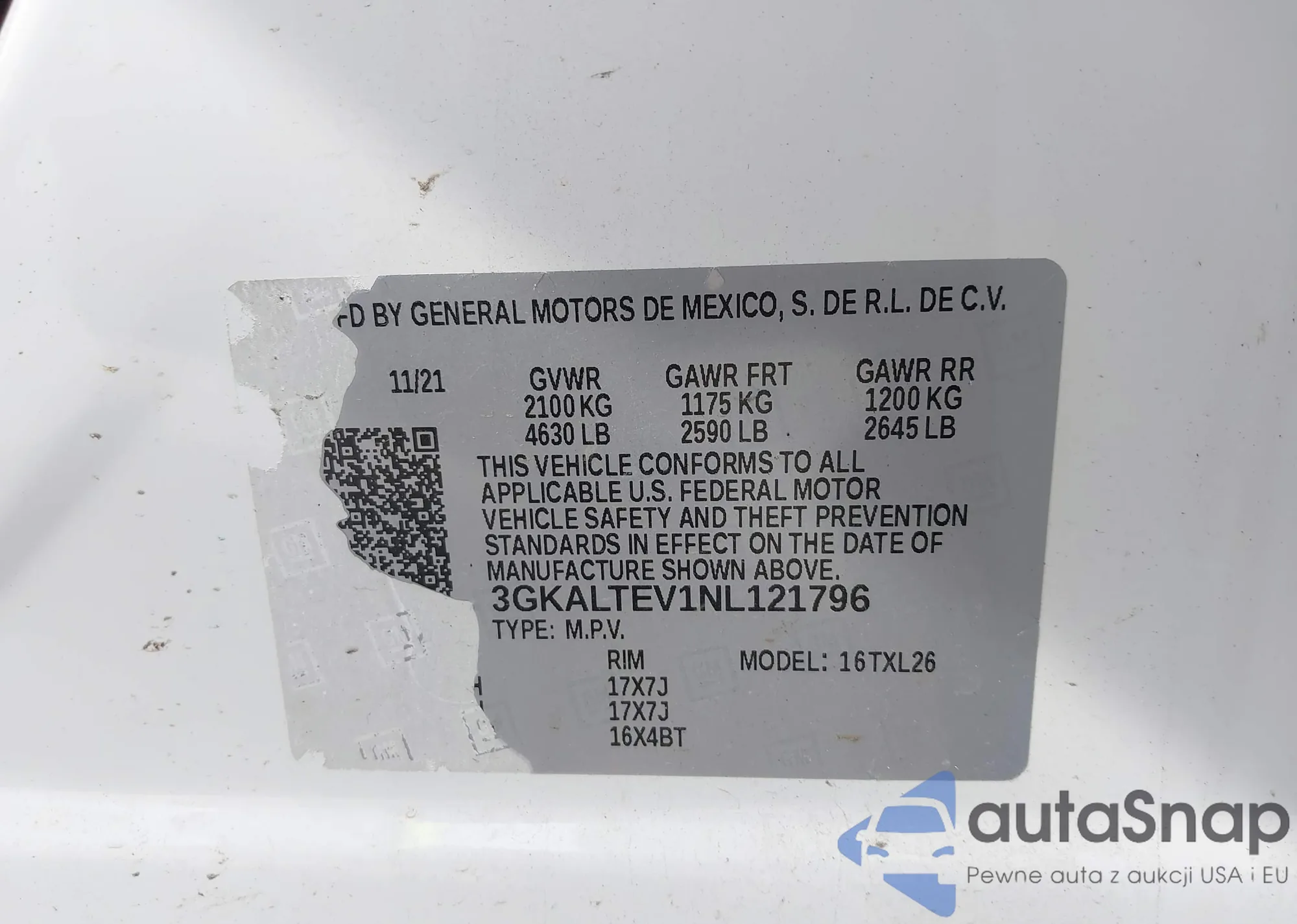 LOT: 43122890 VIN: 3GKALTEV1NL121796