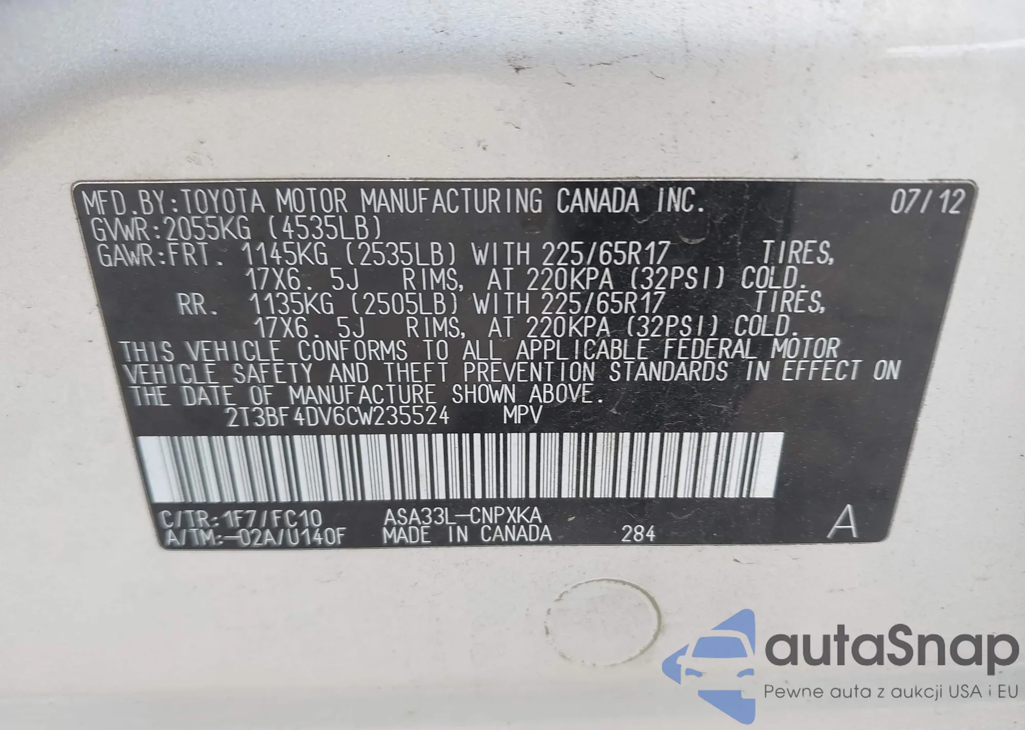 LOT: 43227127 VIN: 2T3BF4DV6CW235524