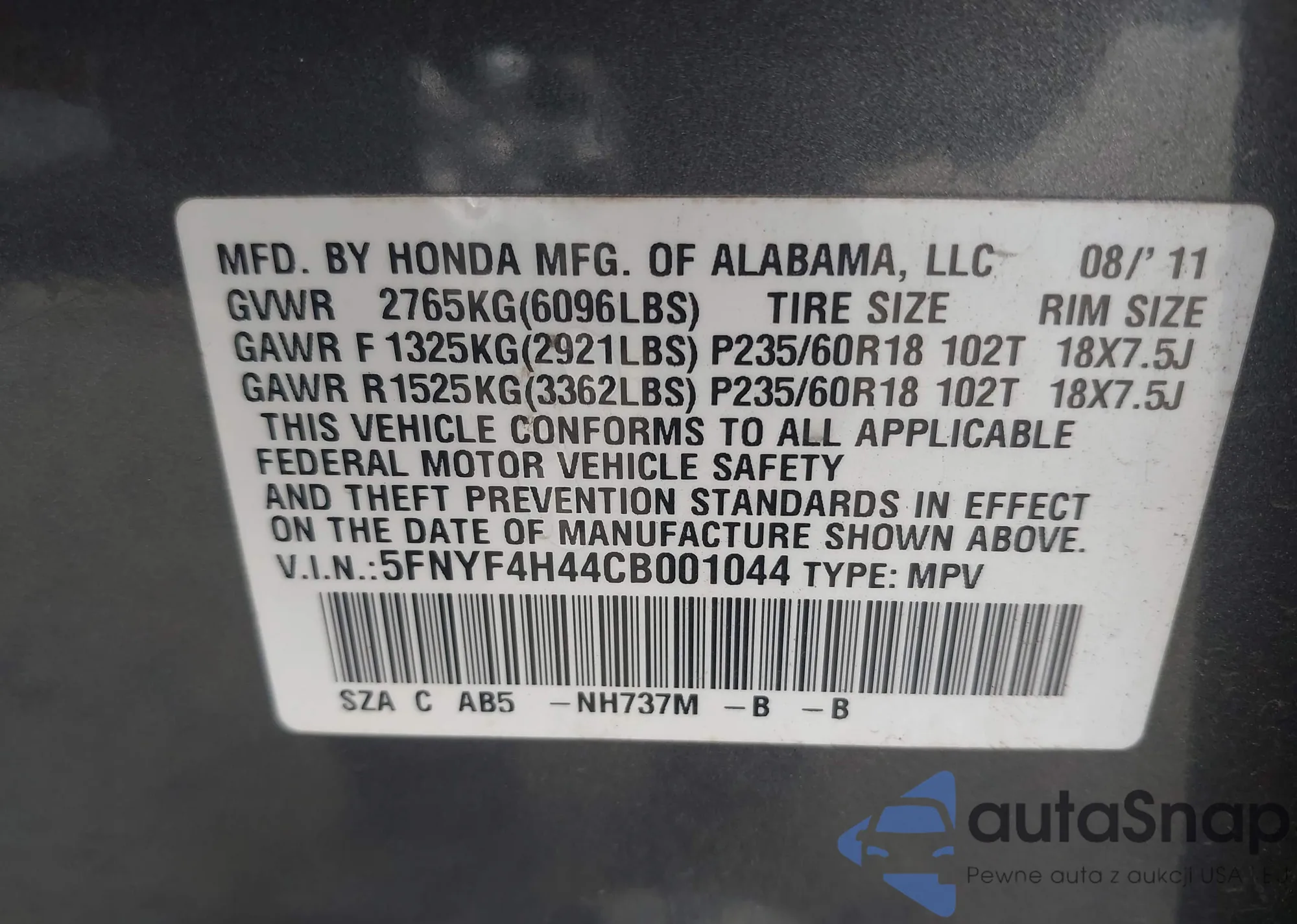 • VIN 5FNYF4H44CB001044