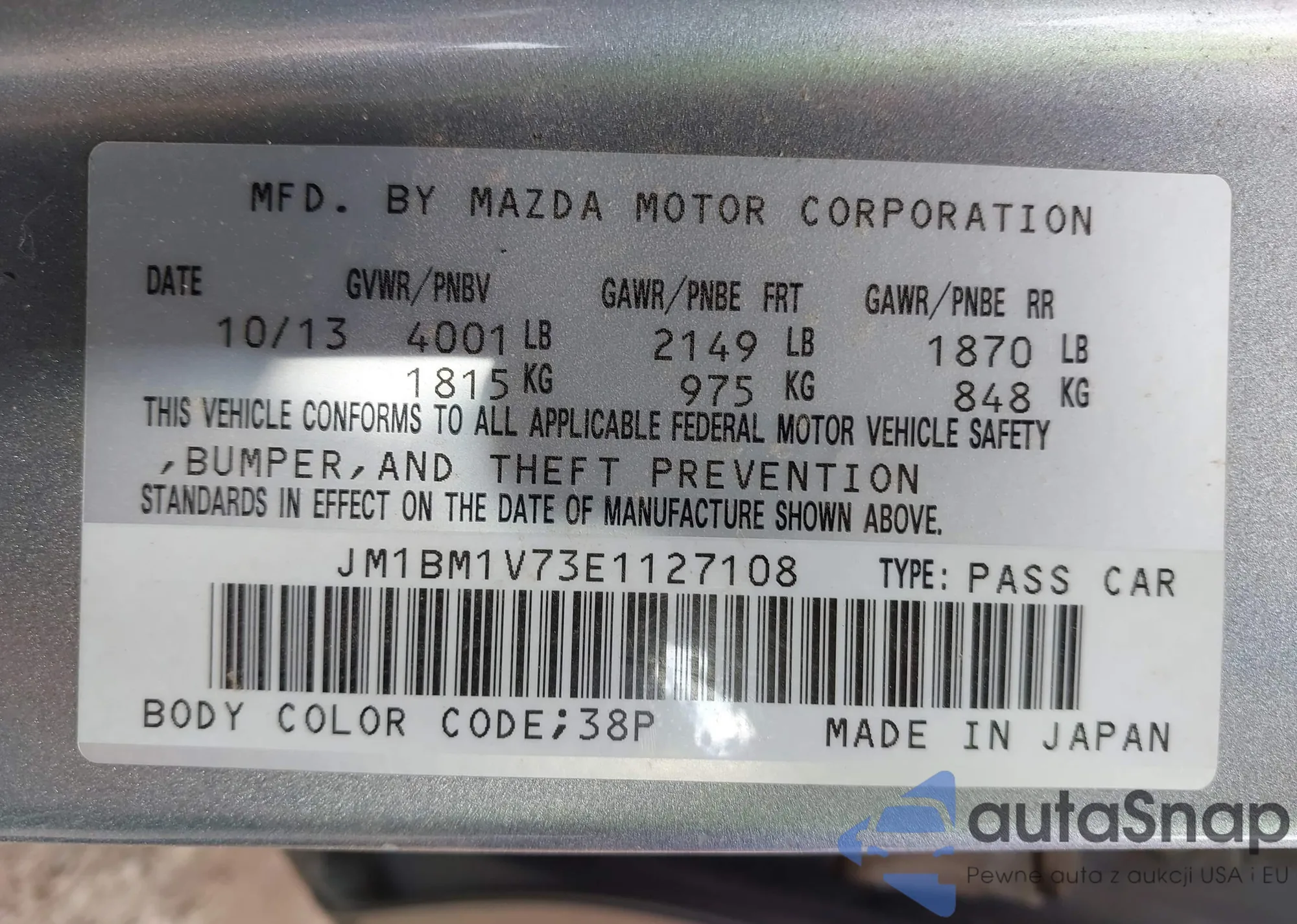 LOT: 43188328 VIN: JM1BM1V73E1127108