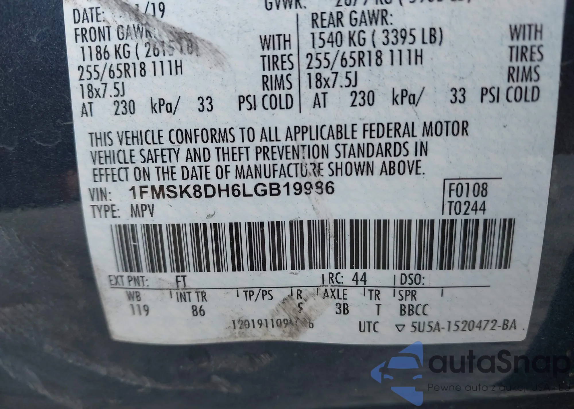 LOT: 43243954 VIN: 1FMSK8DH6LGB19986