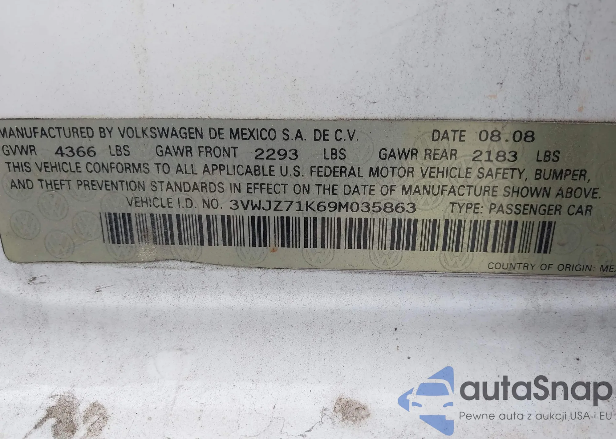• VIN 3VWJZ71K69M035863