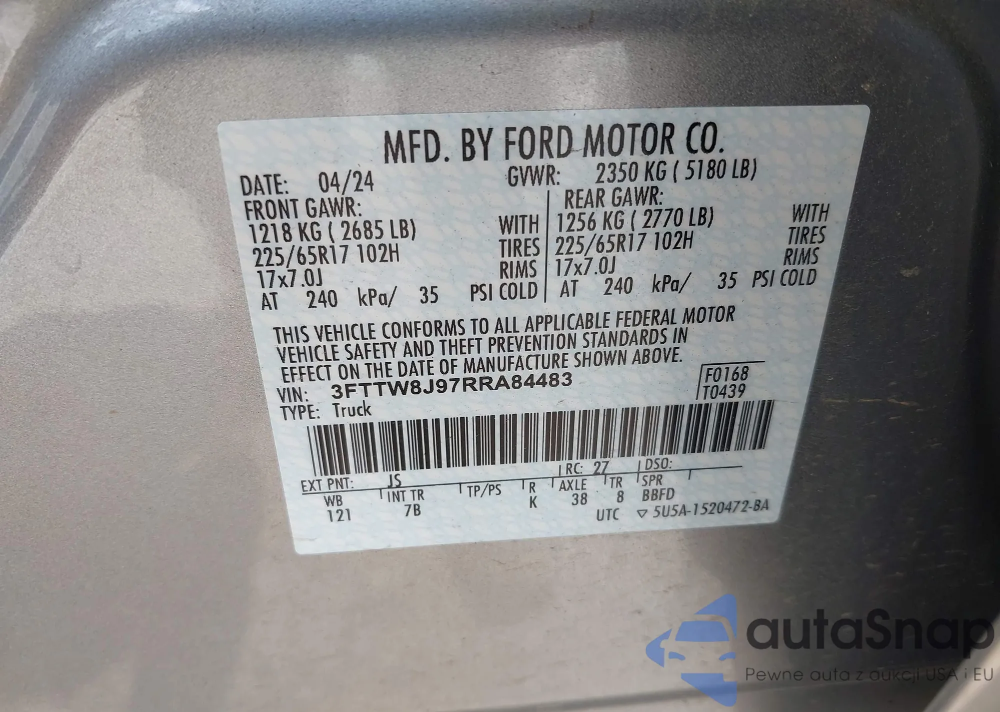 LOT: 43008181 VIN: 3FTTW8J97RRA84483
