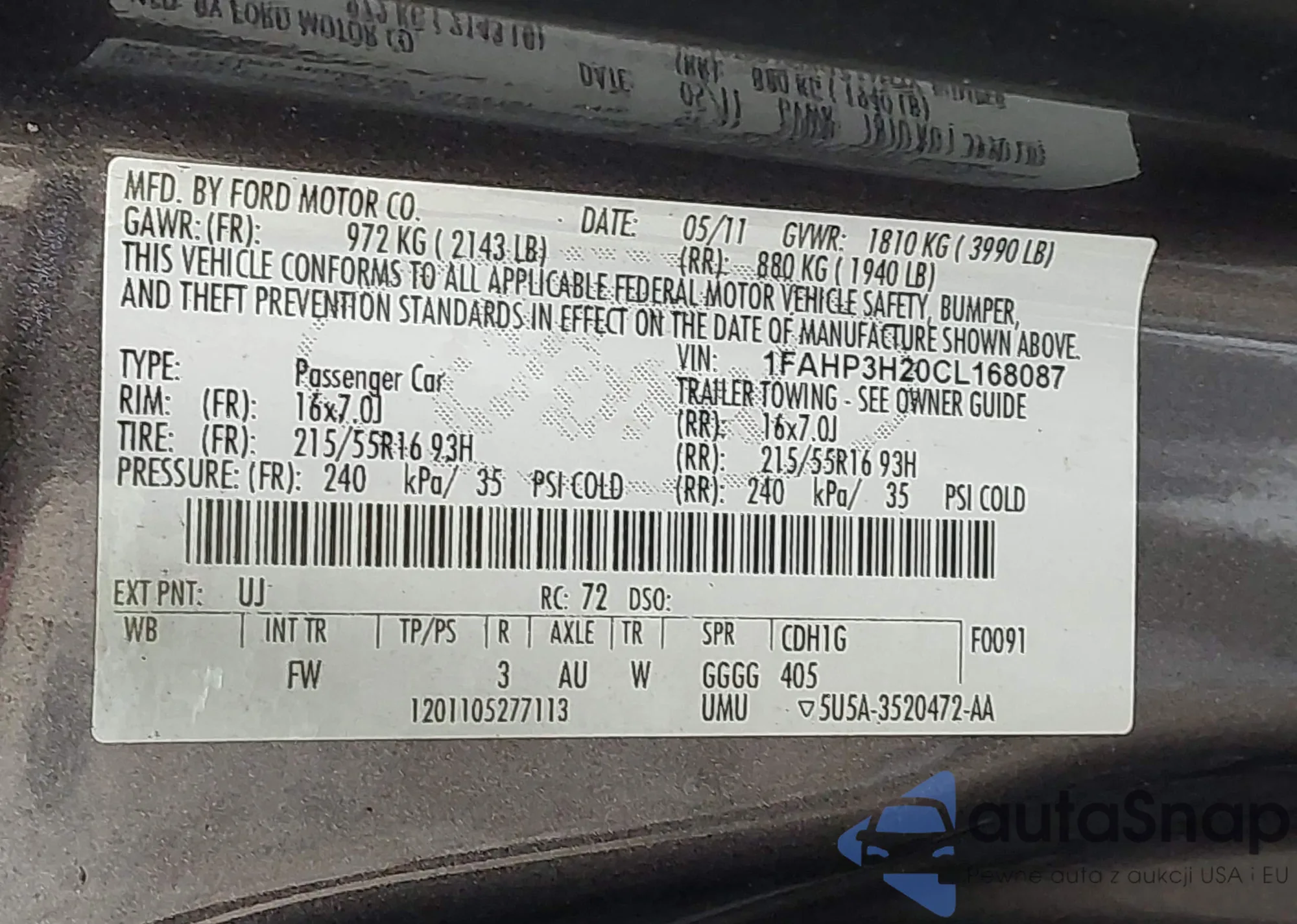 LOT: 43030815 VIN: 3FAHP0HA7CR274754