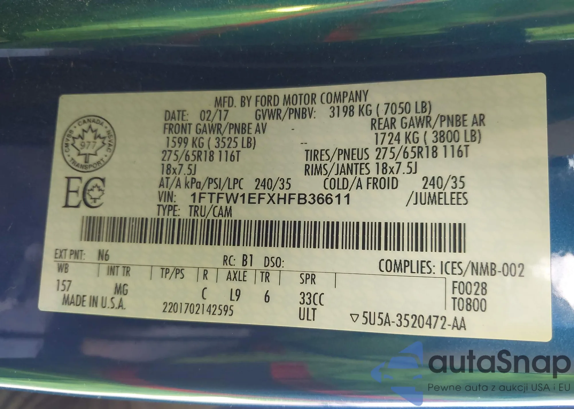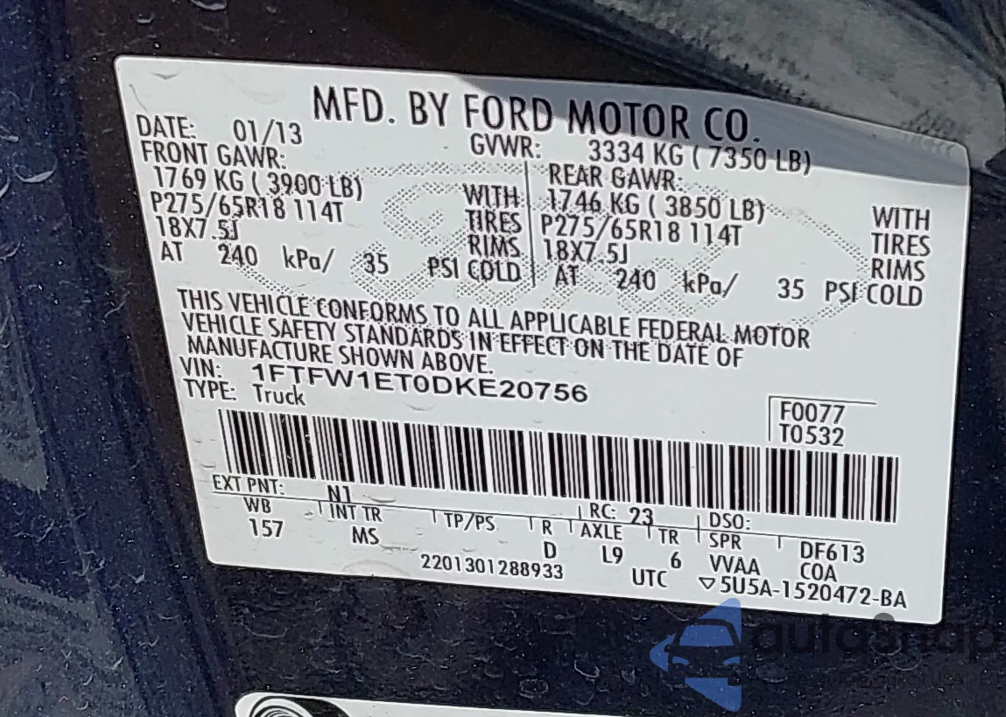 • VIN 1FTFW1ET0DKE20756