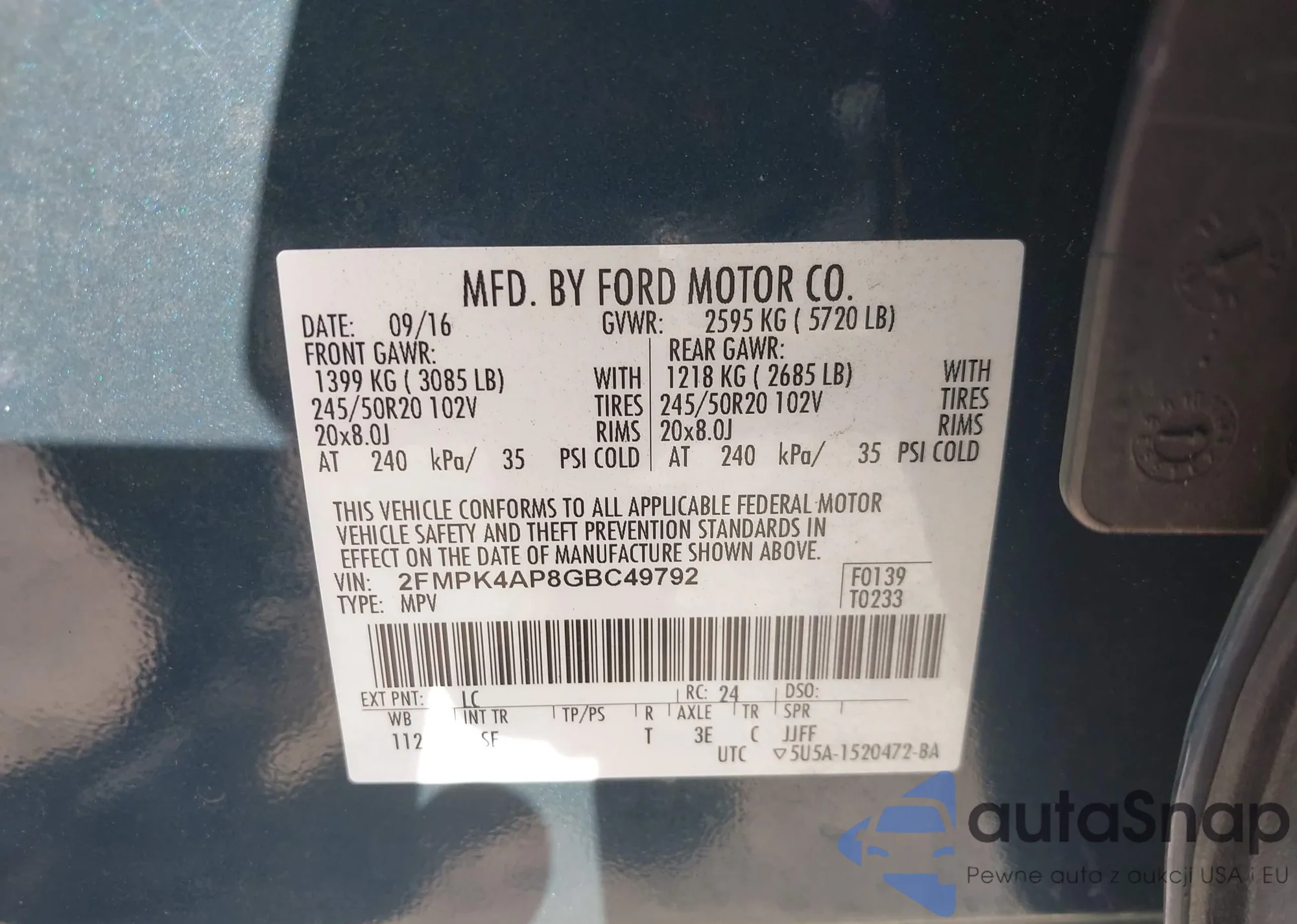 LOT: 43287492 VIN: 1FMCU9J98FUC14539