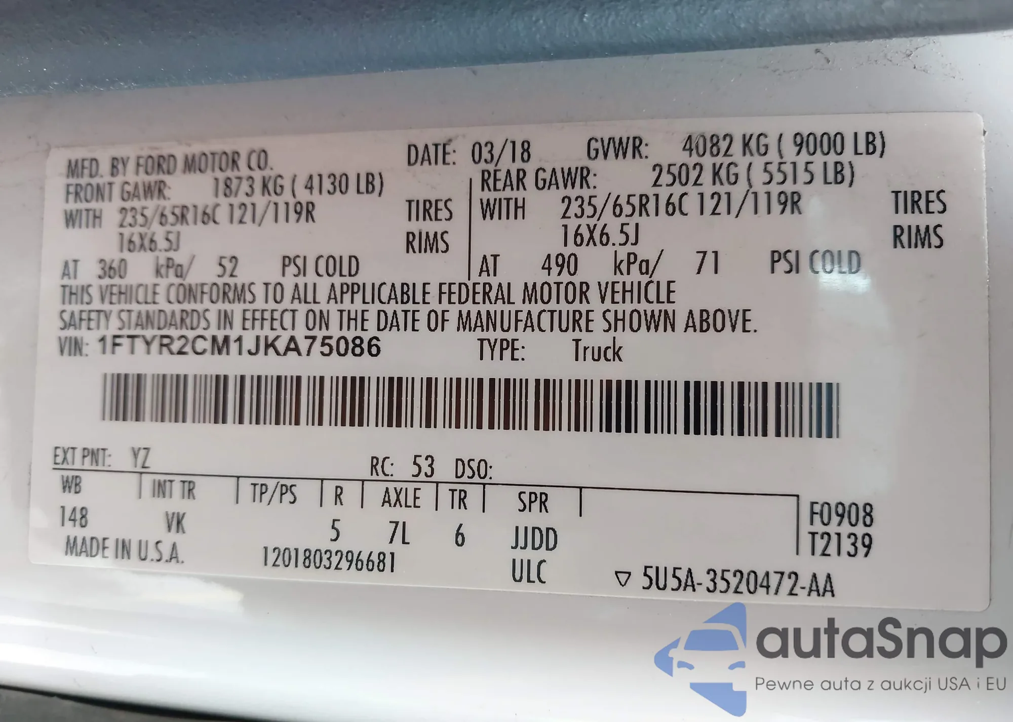 • VIN 1FTYR2CM1JKA75086