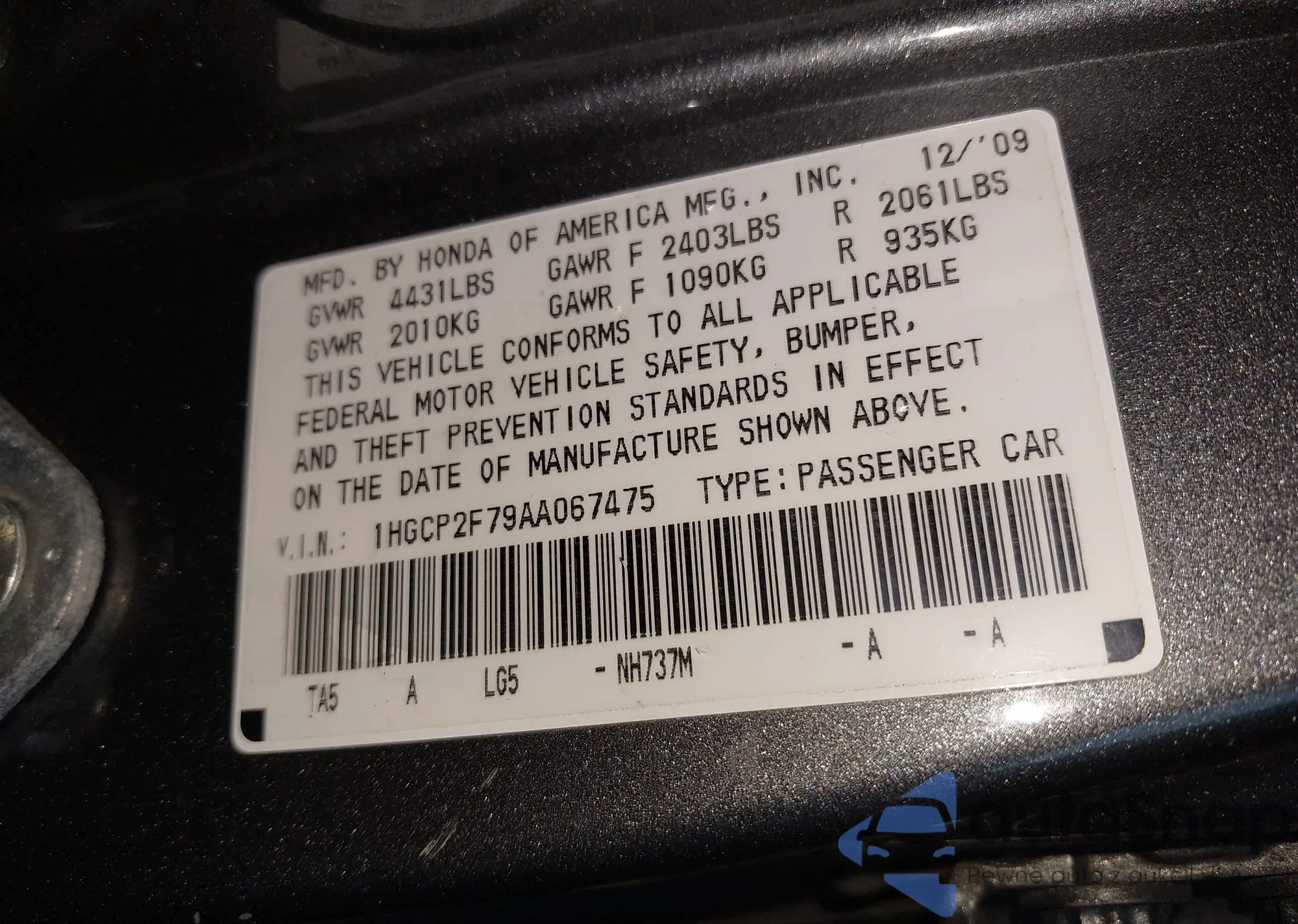 • VIN 1HGCP2F79AA067475