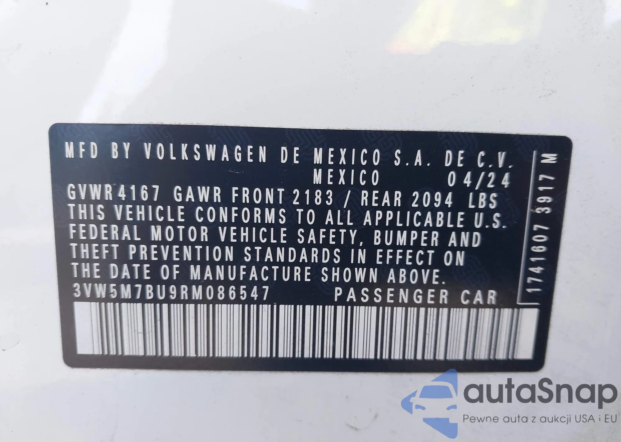 • VIN 3VW5M7BU9RM086547