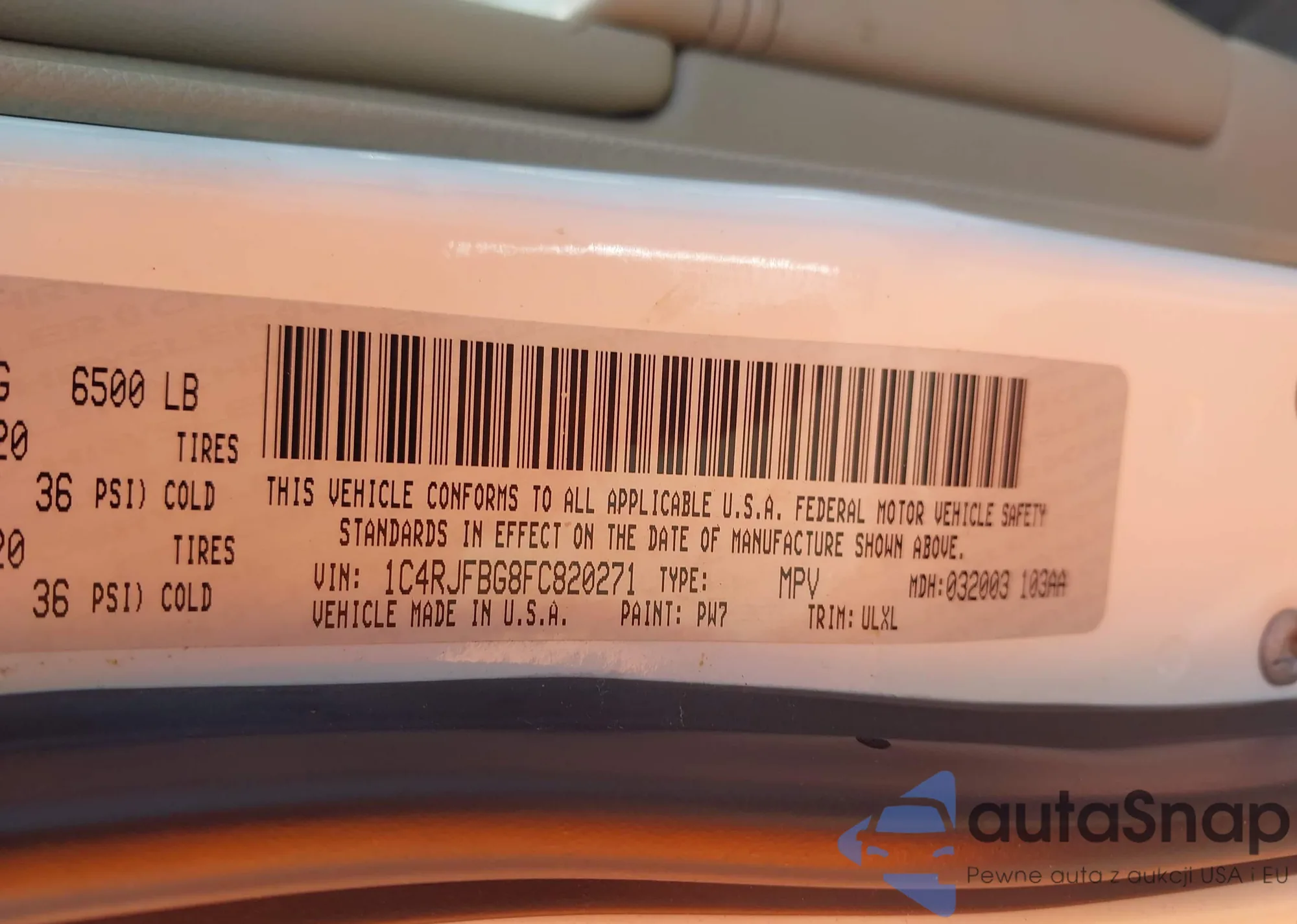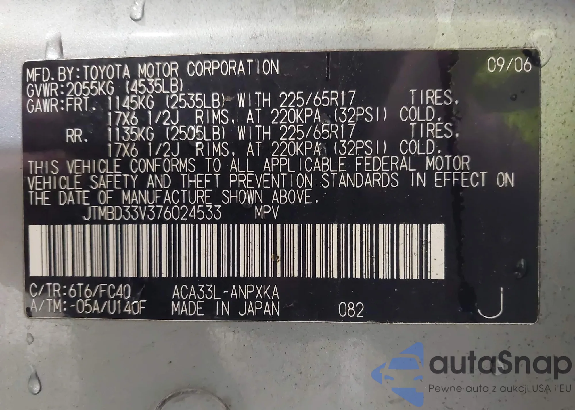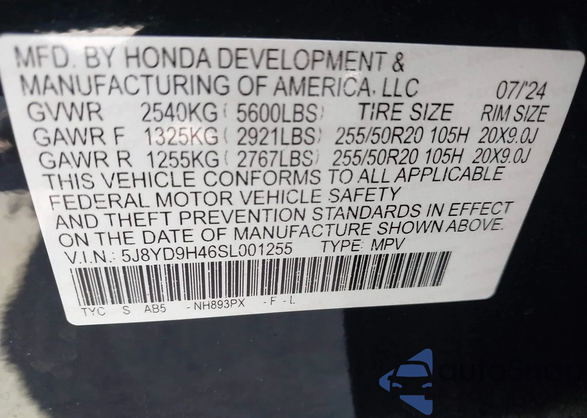 • VIN 5J8YD9H46SL001255